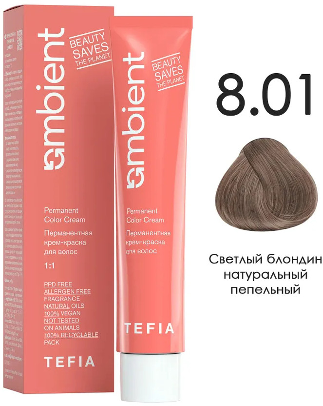 Tefia Крем-краска для волос перманентная, оттенок 8.01 светлый блондин натуральный пепельный