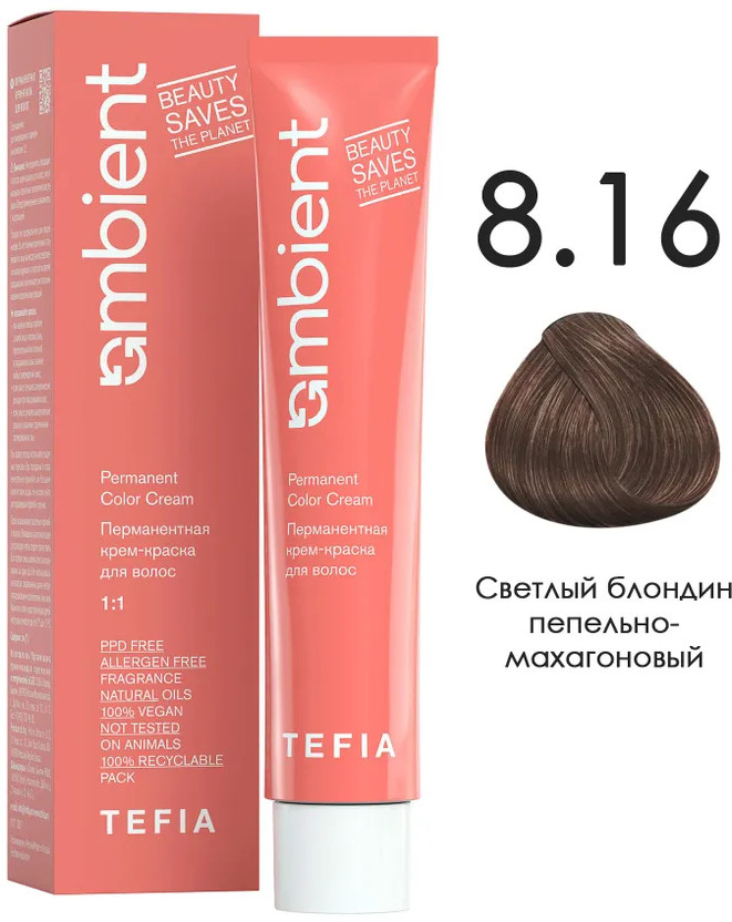 Tefia Крем-краска для волос перманентная, оттенок 8.16 светлый блондин пепельно-махагоновый