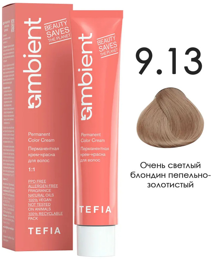 Tefia Крем-краска для волос перманентная, оттенок 9.13 очень светлый блондин пепельно-золотистый