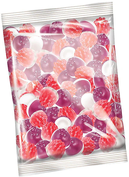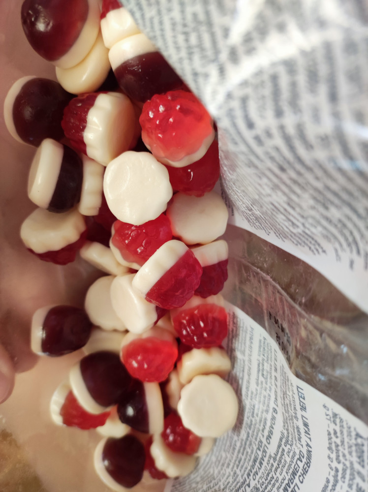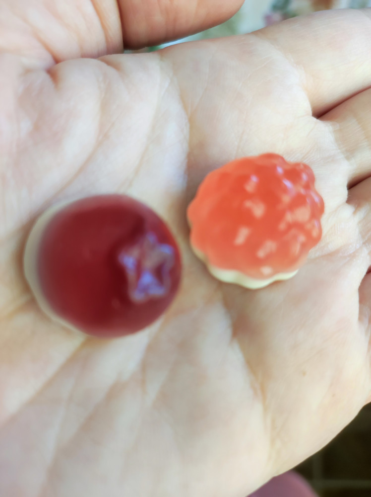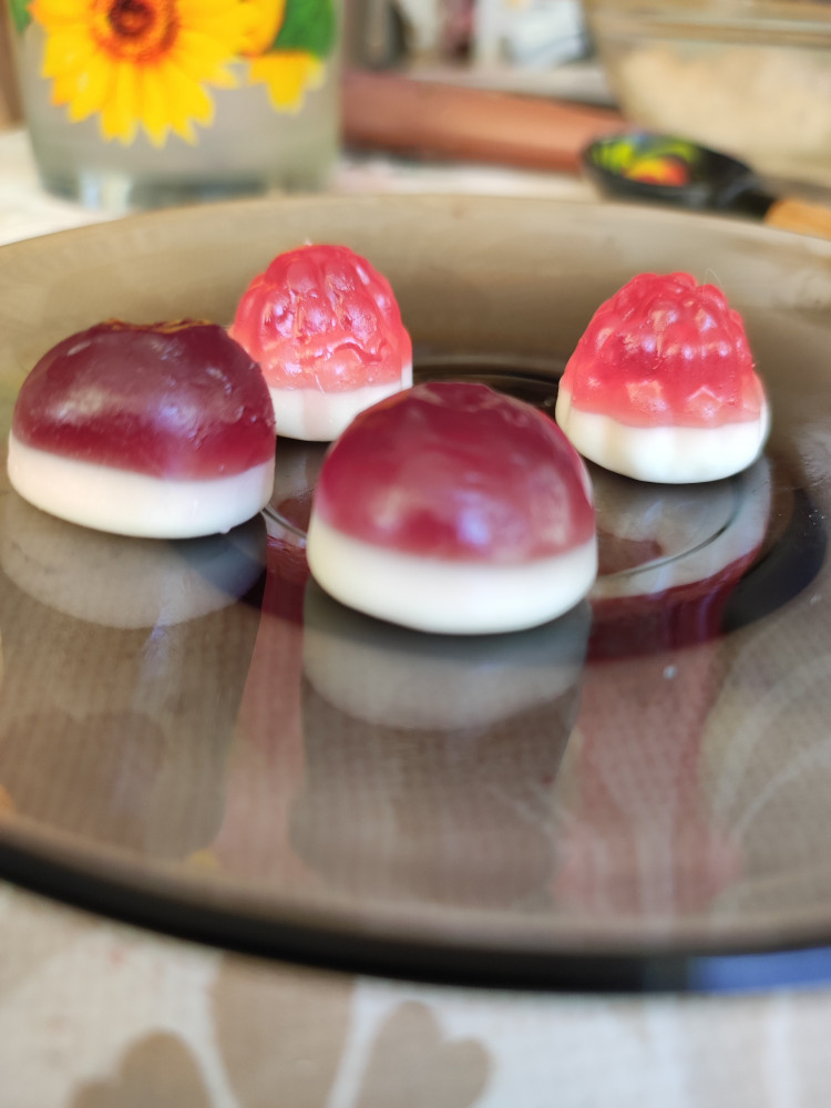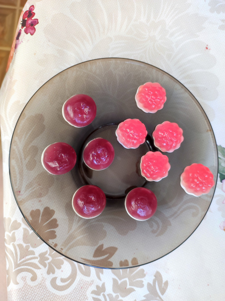 Выглядят эти желейные малютки, словно маленькие пироженки: на белой круглой сливочной основе половинка ягодки малины или черники с соответствующим сиропом внутри. Вкус сладкий, но не приторный. Детям больше понравился вкус малины, а мне черника.