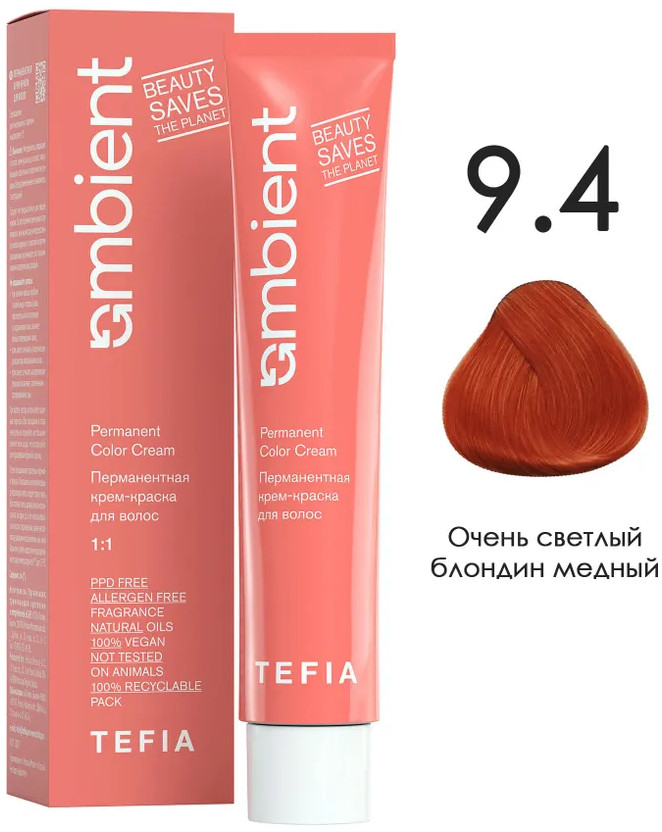 Tefia Крем-краска для волос перманентная, оттенок 9.4 очень светлый блондин медный