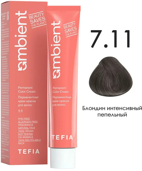 Tefia Крем-краска для волос перманентная, оттенок 7.11 Блондин интенсивный пепельный