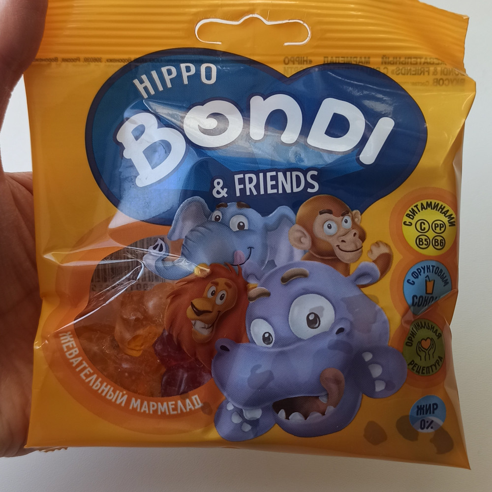 Купила по акции сразу 10 шт. Лет 10 не ела жевательный мармелад. У меня 4 пломбы на жевательных зубах, поэтому опасалась их повредить, так как помню в детстве в начале 2000-х и уже в студенческие годы, жевательный мармелад был достаточно резиновый, в особенности зарубежные, которые продавались на развес. Но к счастью, эти от KDV рассчитаны на маленьких детей. Поэтому мармеладки - маленькие и мягкие, очень свежие. Срок годности аж до мая 2026. Для разделывания не нужно прилагать слишком много сил, челюсть не накачаешь)) Мармеладки без сахарной обсыпки как я и предпочитаю, в форме различных милых мультяшных бегемотиков. На упаковке указано Bondi and friends, и нарисованы ещё другие животные, ожидала что мармеладки будут не только в виде бегемотиков, но внутри только они. Понравился состав: максимально натуральный, без искусственных красителей, ароматизаторов и консервантов. В составе натуральные соки яблок, клубники, апельсина, лимона, черной смородины и черной моркови. Я насчитала 5 вкусов и соответствующих им цветов (зелёный - яблоко, оранжевый - апельсин, жёлтый - лимон, красный - клубника, темно-бордовый - черная смородина). Вкусы яркие, насыщенные, что самое главное не химозный, а натуральные с небольшой кислинкой как бывает в натуральных фруктах (тут добавлена лимонная кислота внутри самих мармеладок). Первый пакетик ела долго по чуть-чуть. А второй пакетик съела за раз все 70гр с кружкой жидкого цикория. Вообщем этот мармелад по составу и вкусу лучшие среди многих аналогичных. Безопасен и полезен как детям, так и взрослым. Так как я не очень люблю сладкое, приторно-сладкое, то для меня единственный небольшой минус - это сладость выше среднего. Если бы сахар чуть меньше добавляли, то эти мармеладки были бы абсолютно идеальны! Все же рекомендую. По достоинству оценят как дети, так и взрослые сладкоежки. Не ожидал от себя, что стану поклонником жевательного мармелада)) По акции купила бы ещё.