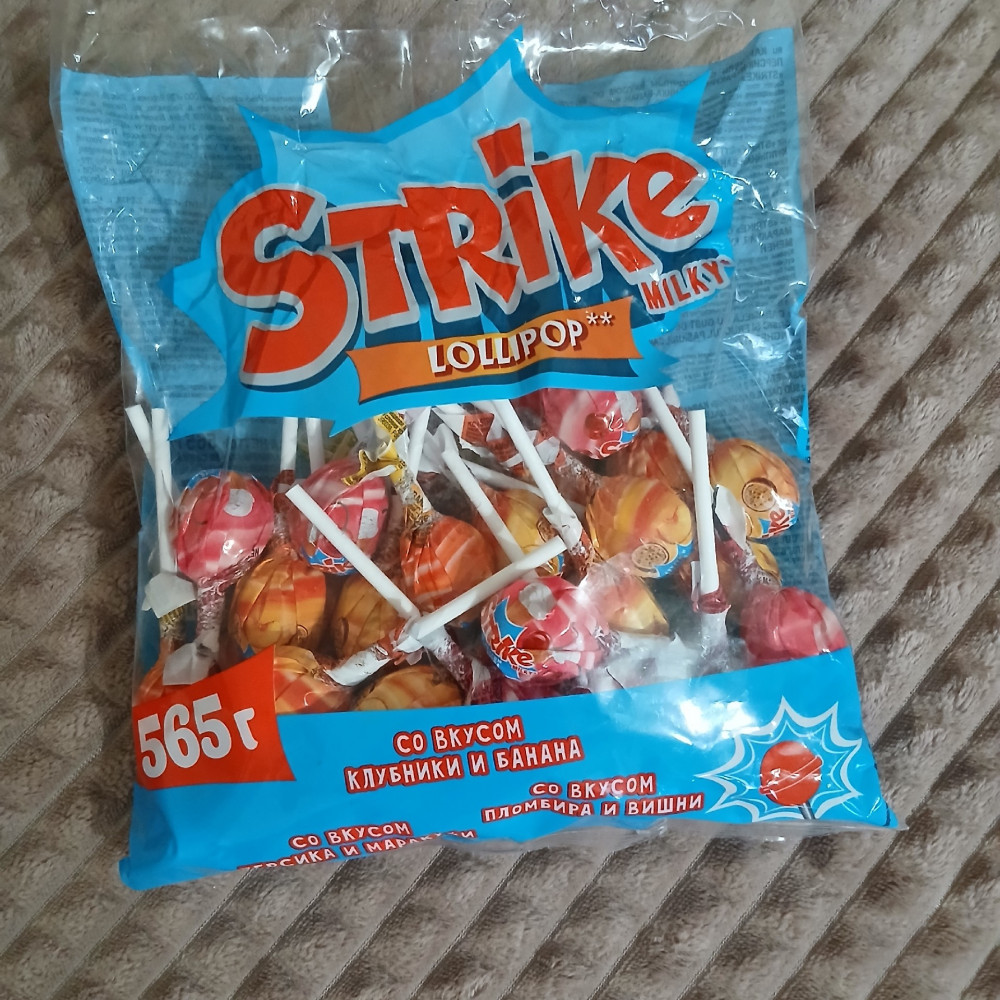 Хочу добавить, что сравнили семьей вкус два вида молочных леденцов Страйк - вот эти, Милк, с розово-желтой оберткой леденцов, и Милкшейк с салатово-голубой оберткой. Взрослым и детям больше понравились именно эти, Милк, с розово -желтой оберткой леденцов.