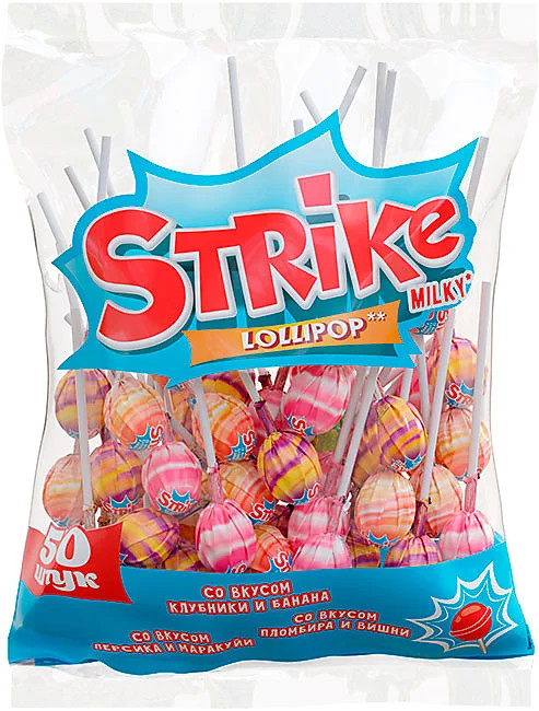 В ассортименте торговой марки «Strike» карамель на палочке со вкусами кисло-сладкого яблока, ароматной клубники, сочного апельсина. Для производства карамели используются натуральные красители. |
