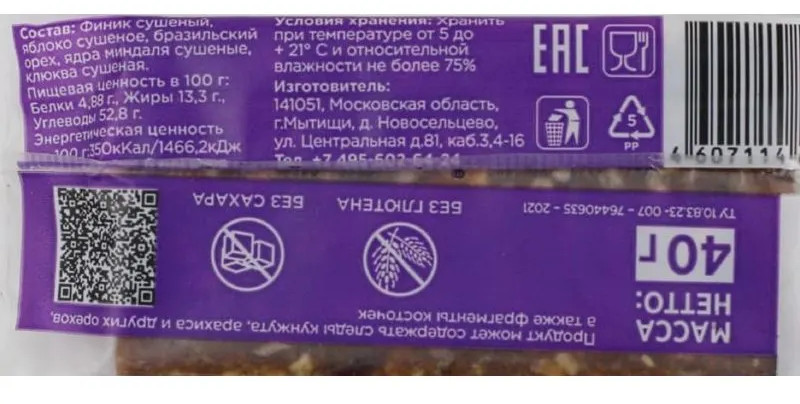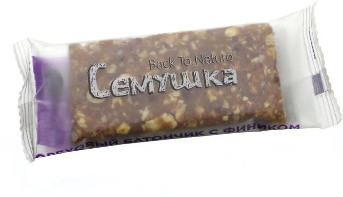 Фруктово-ореховый батончик с суперпростым, 100% натуральным составом. Батончик без добавления сахара, естественную сладость ему дарят финики, которые не зря называют «ягодами жизни». Финики богаты витаминами и микроэлементами, в том числе таким антиоксидант, как селен. Они быстро утоляют голод, восполняют запасы энергии, укрепляют иммунитет и повышают работоспособность. Второй ингредиент батончиков — орехи — тоже являются природными источниками ценных веществ: витаминов, минералов и омега-3 жирных кислот. Батончик хорошо сочетается с чаем и кофе. Его удобно брать с собой и есть даже на ходу.