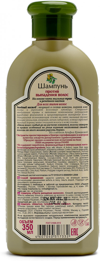 💳 Оплатить за товар можно при получении 🇰🇿 Есть бесплатная доставка по Казахстану от 1 дня 🎁 Копите бонусы с каждой покупки Шампунь против выпадения на основе пяти мыльных трав и репейного настоя для всех типов волос. |