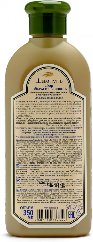 💳 Оплатить за товар можно при получении 🇰🇿 Есть бесплатная доставка по Казахстану от 1 дня 🎁 Копите бонусы с каждой покупки Пшеничная вода, входящая в состав шампуня, придает волосам естественный объем, а специально подобранные травы укрепляют их от корней до самых кончиков. Натуральная вспенивающая основа на пяти мыльных травах (солодка уральская, амарант, качим сибирский, белый и красный мыльные корни) мягко очищает волосы и кожу головы. |