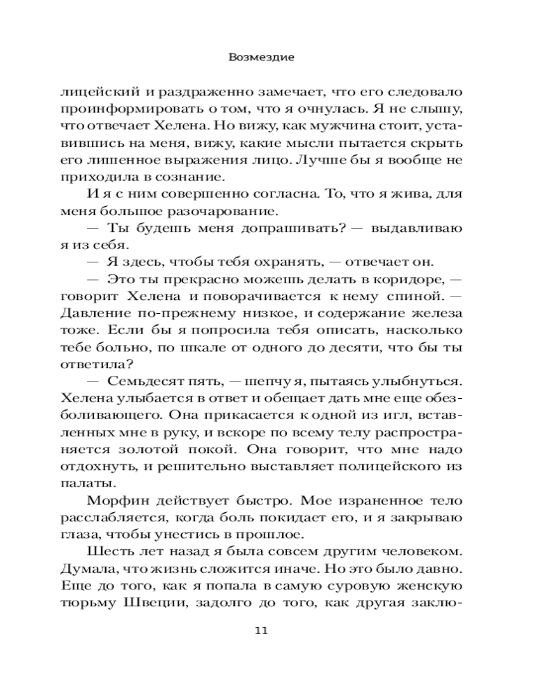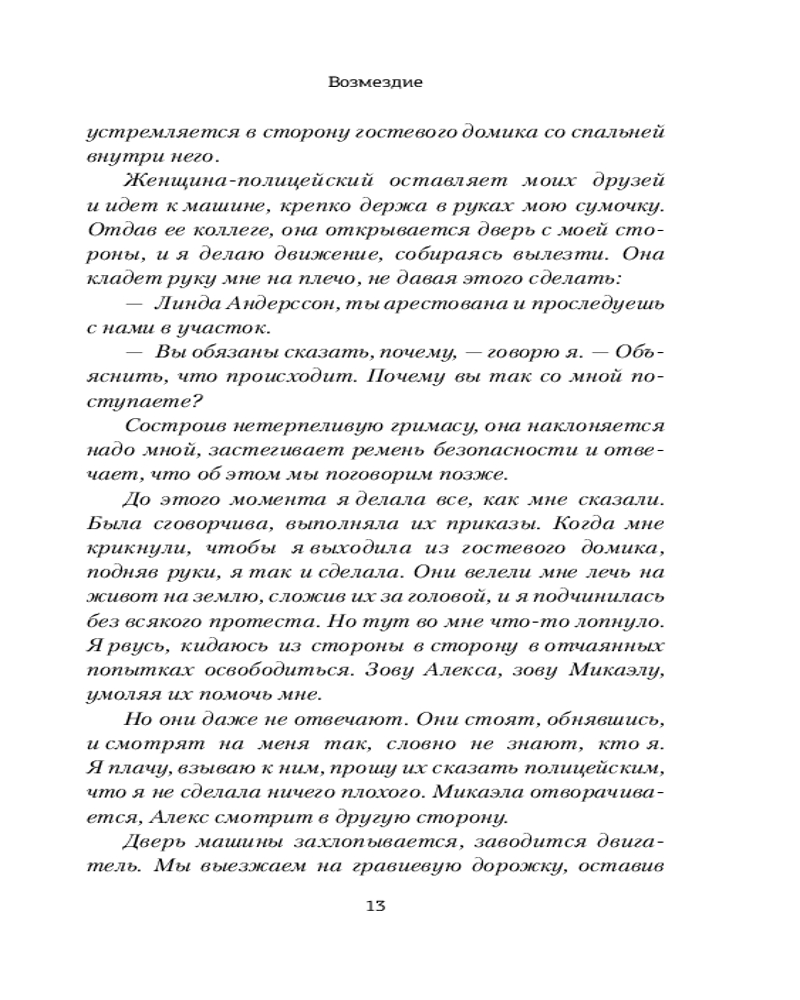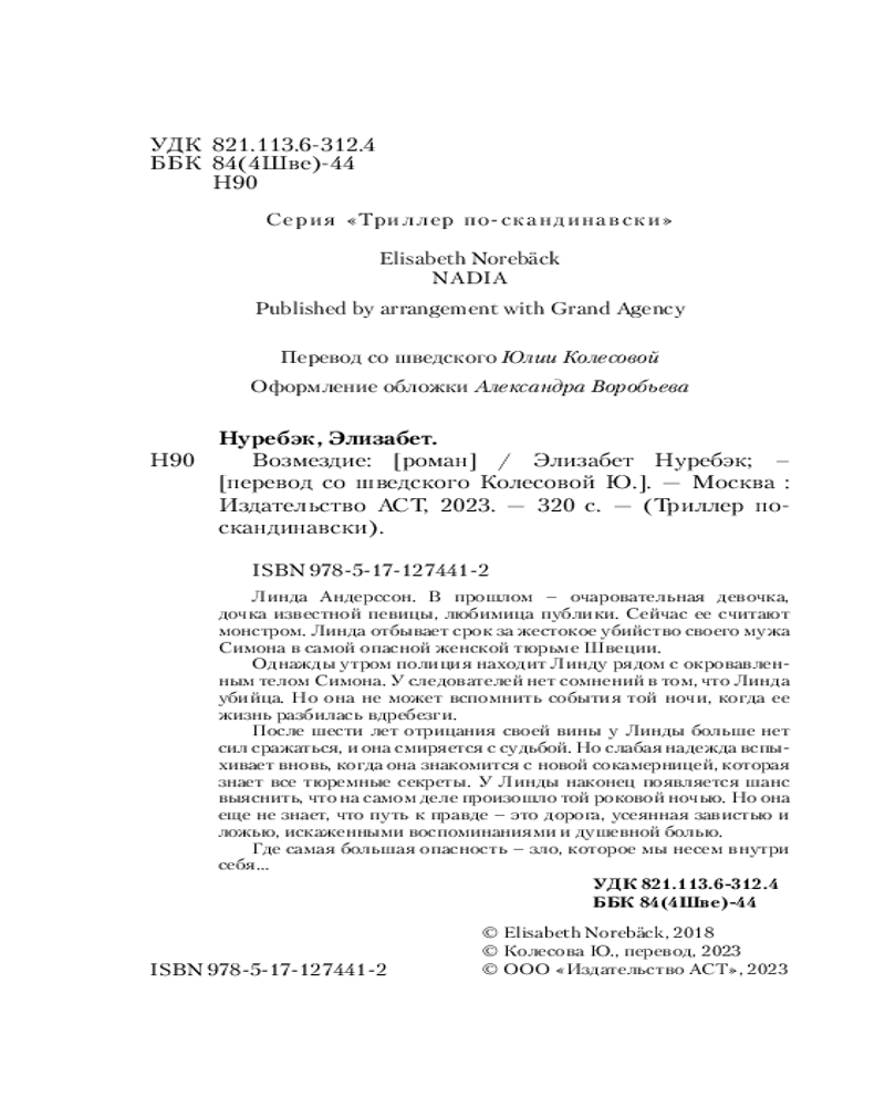 💳 Оплатить за товар можно при получении 🇰🇿 Есть бесплатная доставка по Казахстану от 1 дня 🎁 Копите бонусы с каждой покупки Серия: Триллер по-скандинавски Линда Андерссон. В прошлом — очаровательная девочка, дочка известной певицы, любимица публики. Сейчас ее считают монстром. Линда отбывает срок за жестокое убийство своего мужа Симона в самой опасной женской тюрьме Швеции. Однажды утром полиция находит Линду рядом с окровавленным телом Симона. У следователей нет сомнений в том, что Линда убийца. Но она не может вспомнить события той ночи, когда ее жизнь разбилась вдребезги. После шести лет отрицания своей вины у Линды больше нет сил сражаться, и она смиряется с судьбой. Но слабая надежда вспыхивает вновь, когда она знакомится с новой сокамерницей, которая знает все тюремные секреты. У Линды наконец появляется шанс выяснить, что на самом деле произошло той роковой ночью. Но она еще не знает, что путь к правде — это дорога, усеянная завистью и ложью, искаженными воспоминаниями и душевной болью. Где самая большая опасность — зло, которое мы несем внутри себя... |