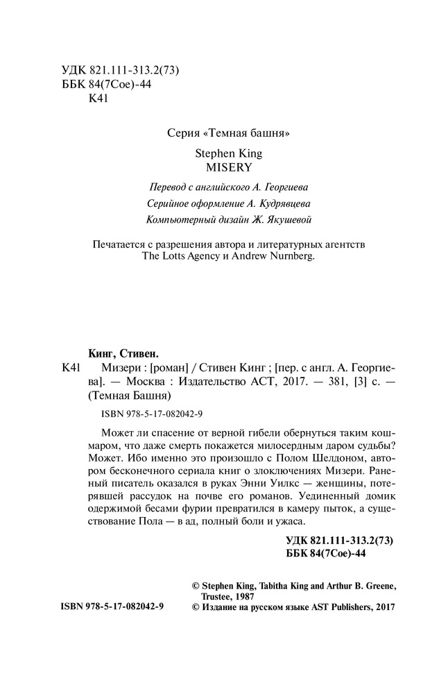 МизериВ данный момент этот товар отсутствует в продаже. Возможно, у нас найдется аналогичный или похожий товар здесь. Может ли спасение от верной гибели обернуться таким кошмаром, что даже смерть покажется милосердным даром судьбы? Может. Ибо именно это произошло с Полом Шелдоном, автором бесконечного сериала книг о злоключениях Мизери. Раненый писатель оказался в руках Энни Уилкс — женщины, потерявшей рассудок на почве его романов. Уединенный домик одержимой бесами фурии превратился в камеру пыток, а существование Пола — в ад, полный боли и ужаса. |