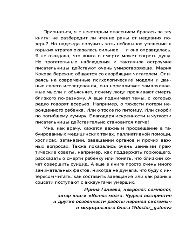 Когда умирает близкий человек, кто-то замыкается в себе, а кто-то относится к известию более спокойно и не меняет образ жизни. О том, почему реакция на утрату может быть разной, сколько длится горевание и как помочь себе или близкому пережить потерю, вы узнаете из этой книги.