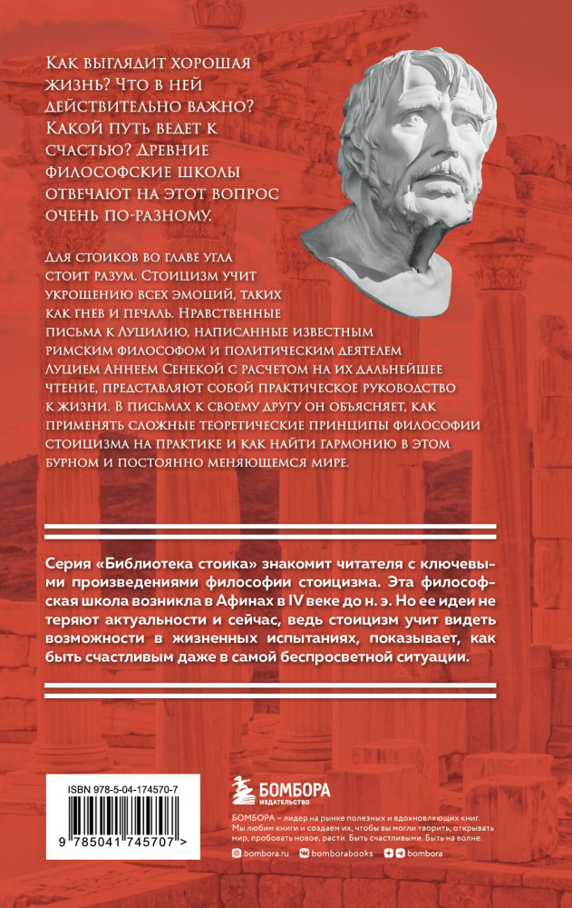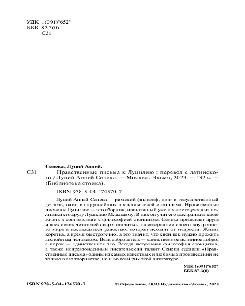 💳 Оплатить за товар можно при получении 🇰🇿 Есть бесплатная доставка по Казахстану от 1 дня 🎁 Копите бонусы с каждой покупки Серия: Библиотека стоика Луций Анней Сенека — крупный римский философ-стоик, воспитатель Нерона, поэт и государственный деятель. В течение нескольких лет своей бурной жизни Сенека фактически направлял политику Римской империи. Его принципы основывались главным образом на философии стоицизма, которая первоначально была разработана несколькими веками ранее в Афинах. Этот сборник писем Сенеки показывает, что он отстаивал строгие этические идеалы стоицизма — мудрость хладнокровного человека, невосприимчивого к поглощающим всё эмоциям и жизненным неудачам, — ценя при этом дружбу и мужество простых людей и критикуя жестокое обращение с рабами и жестокости на гладиаторской арене. Его человечность, остроумие и мудрость сделали «Нравственные письма к Луцилию» выдающимся произведением не только в древнеримской, но и в мировой литературе. |