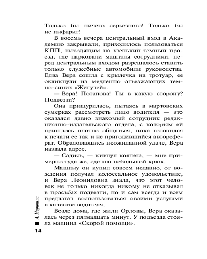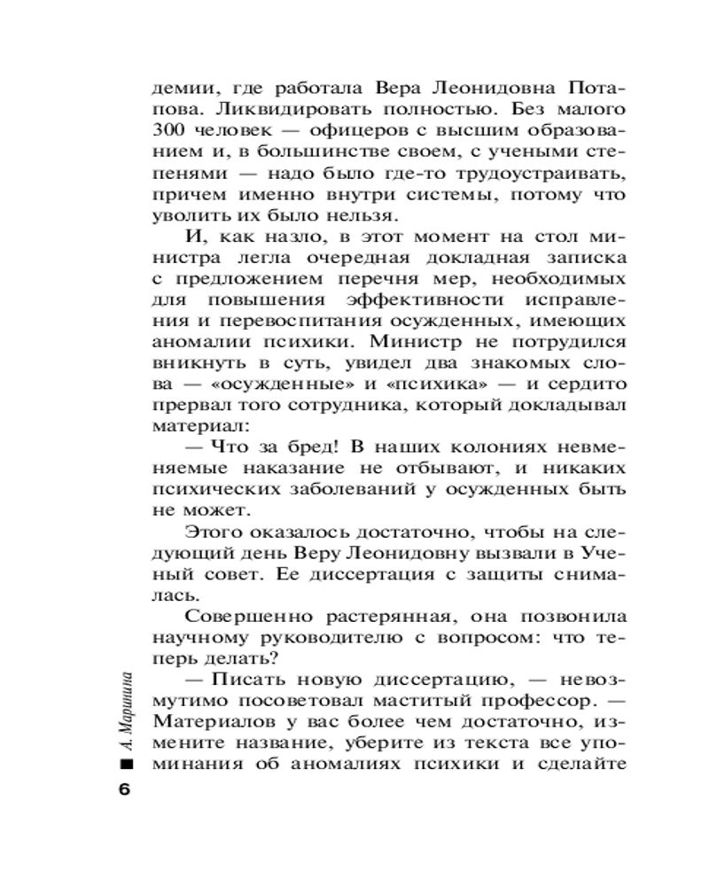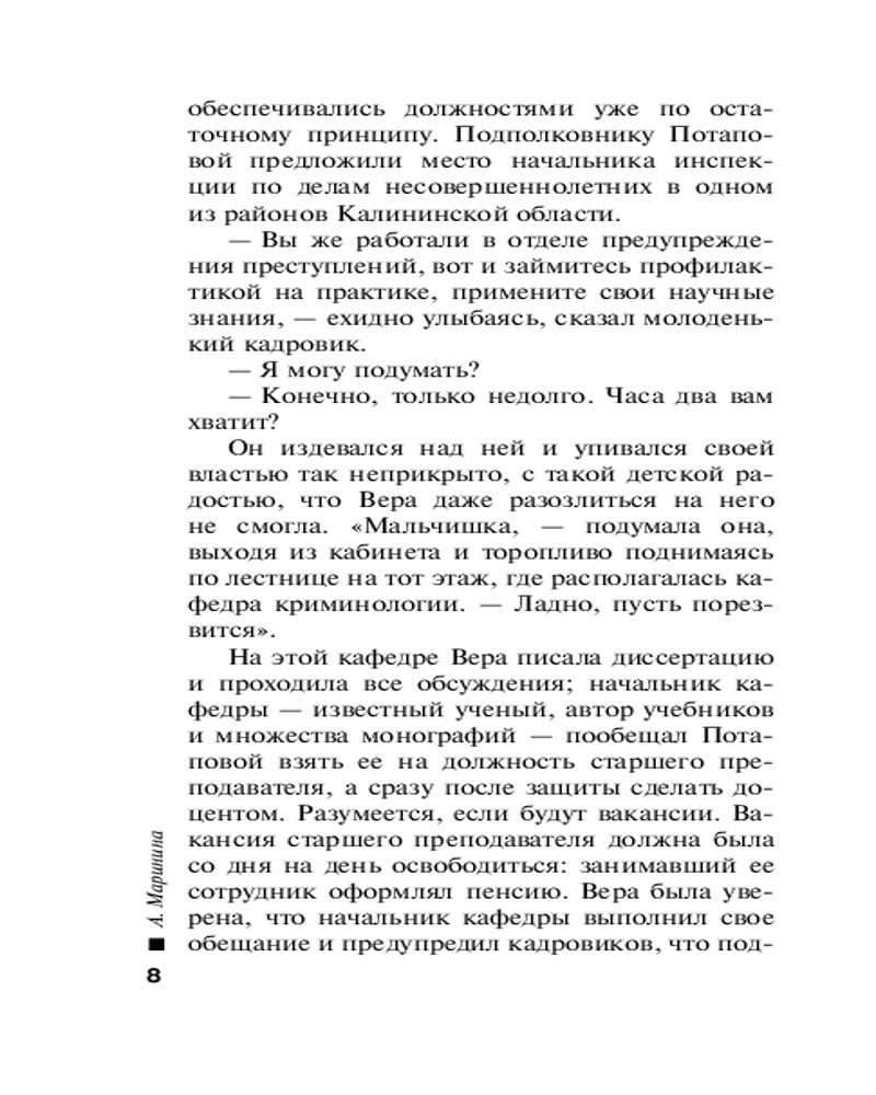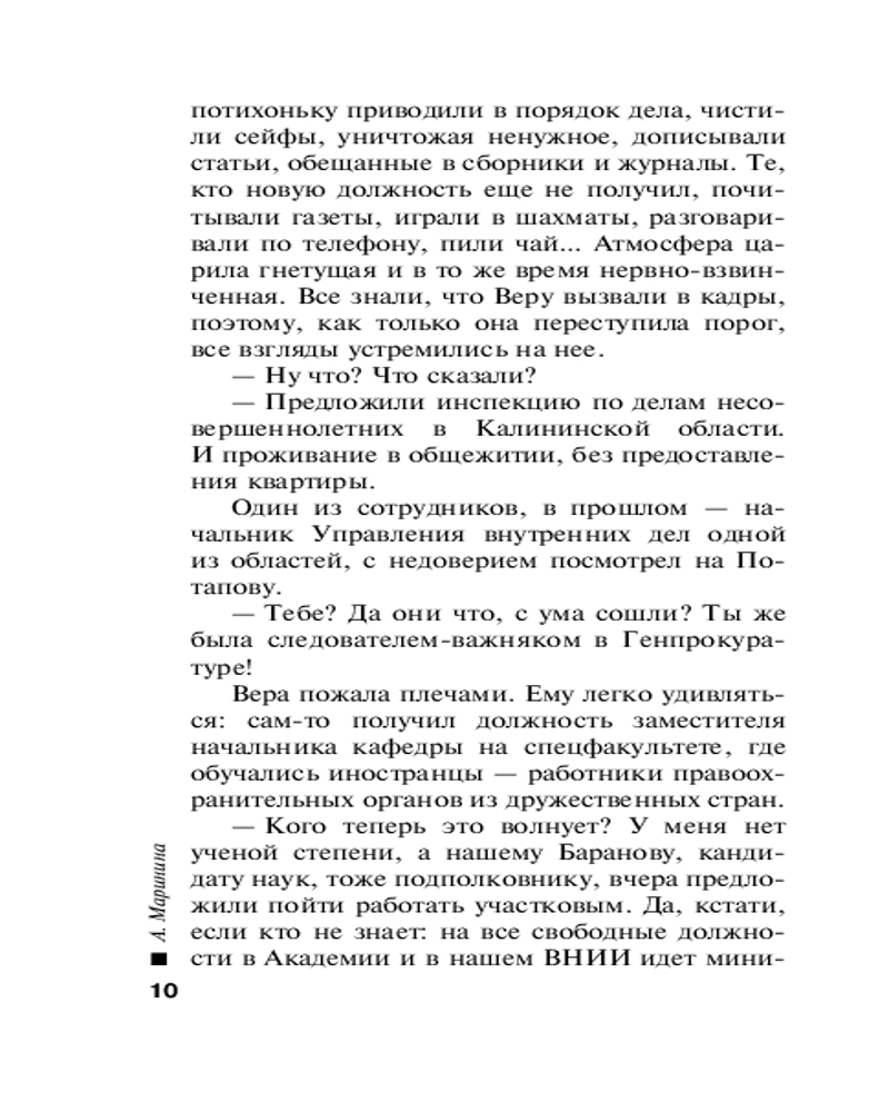 «В диалогах художественной и тривиальной литературы можно обнаружить разные способы стилизации «устности», чтобы достичь впечатления спонтанного разговора. Обиходная речь в романах А. Марининой отличается необыкновенно высокой степенью оживленности, что выражается, между прочим, в разных формах обращения собеседников, в различных оттенках вежливости и в эмоциональности используемой лексики». — Вольфганг Штадлер, Университет имени Леопольда Францена, Инсбрук, Австрия |