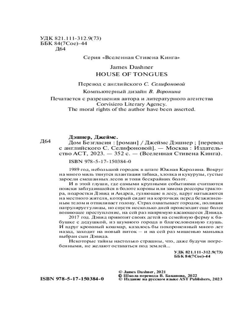 Серия: Вселенная Стивена Кинга 1989-й год, небольшой городок в штате Южная Каролина. Вокруг на много миль тянутся плантации табака, хлопка и кукурузы, густые заросли смешанных лесов и топи бескрайних болот.