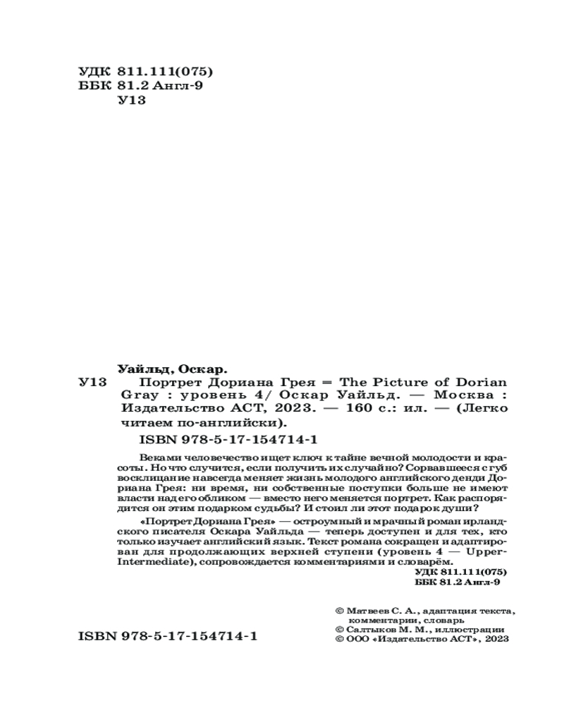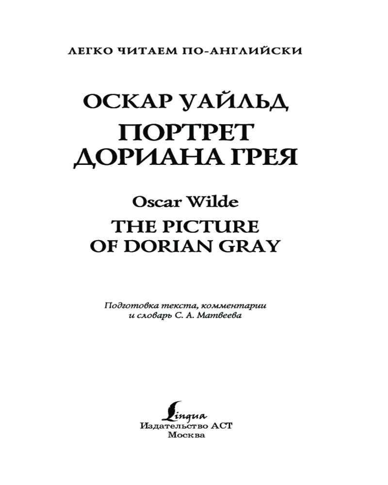В данный момент этот товар отсутствует в продаже. Возможно, у нас найдется аналогичный или похожий товар здесь. Серия: Легко читаем по-английски Веками человечество ищет ключ к тайне вечной молодости и красоты. Но что случится, если получить их случайно? Сорвавшееся с губ восклицание навсегда меняет жизнь молодого английского денди Дориана Грея: ни время, ни собственные поступки больше не имеют власти над его обликом — вместо него меняется портрет. Как распорядится он этим подарком судьбы? И стоил ли этот подарок души?