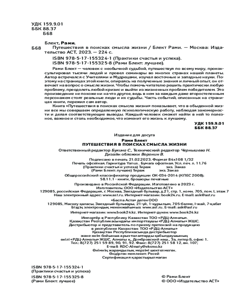 💳 Оплатить за товар можно при получении 🇰🇿 Есть бесплатная доставка по Казахстану от 1 дня 🎁 Копите бонусы с каждой покупки Серия: Рами Блект: лучшее Рами Блект — человек с необычной судьбой, путешествуя по всему миру, проконсультировал тысячи людей и провел семинары во многих странах нашей планеты. Автор встречался с Учителями и Мудрецами, изучал восточные и западные науки. Поэтому на страницах этой книги, опираясь на полученные знания и личный опыт, он отвечает на вопрос о смысле жизни. Чтобы помочь читателю решить практически любую проблему, преодолеть любой кризис и выйти из жизненных проблем победителем. Это произведение не похоже ни на что другое, ведь в нем за каждым, даже второстепенным, персонажем стоят реальные люди и их судьбы. Часть событий, описанных на страницах книги, пережил сам автор. |