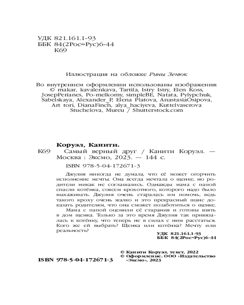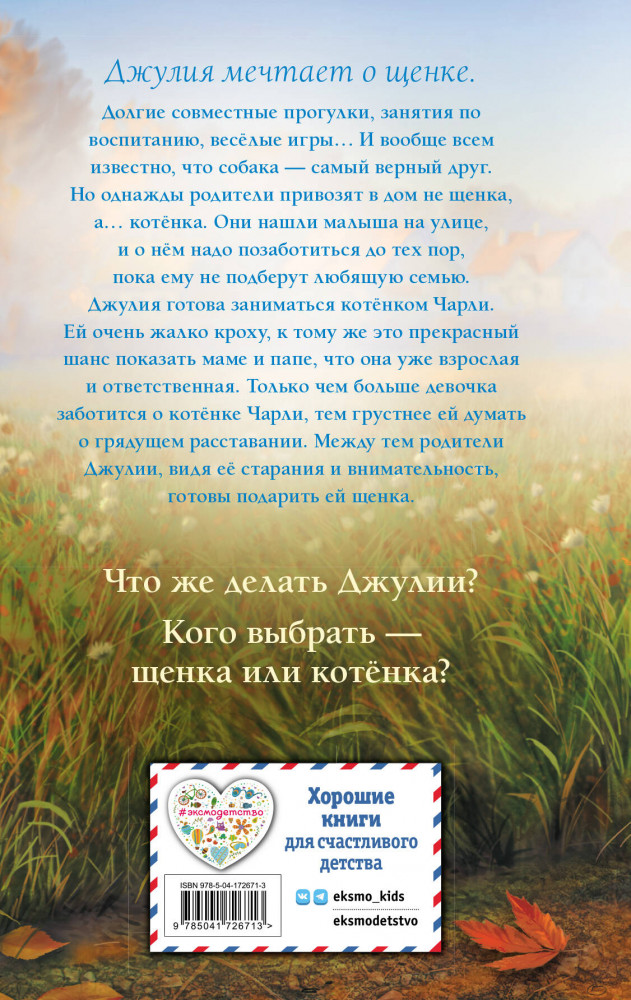 Самый верный другВ данный момент этот товар отсутствует в продаже. Возможно, у нас найдется аналогичный или похожий товар здесь. Серия: Детск. Истории для уютного чтения Может ли котёнок стать верным другом? На самом деле вопрос вовсе не глупый. Джулии надо очень быстро решить, кто будет её питомцем — щенок, о котором она так давно мечтала, или котёнок, которого она выхаживала уже несколько недель. Кого же Джулия выберет? Щенка или котёнка? |