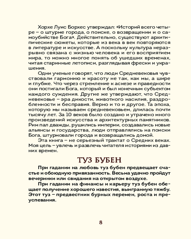 💳 Оплатить за товар можно при получении 🇰🇿 Есть бесплатная доставка по Казахстану от 1 дня 🎁 Копите бонусы с каждой покупки Серия: Карты для гаданий. Таро Оракул Средневековья — это уникальный авторский проект, в котором собраны базовые мифологические образы из событий эпохи средневековья и увлекательные истории о древних принцессах и драконах, о королях и шутах. Эти истории — не исследование культуры Средних веков. Это увлекательное чтение и полезный инструмент для гадания, исследования собственного подсознания и игры. |