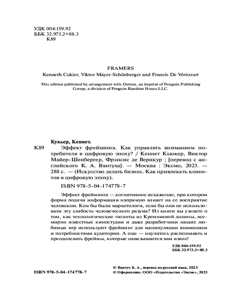 💳 Оплатить за товар можно при получении 🇰🇿 Есть бесплатная доставка по Казахстану от 1 дня 🎁 Копите бонусы с каждой покупки Серия: Искусство делать бизнес. Как привлекать клиентов в цифровую эпоху Права человека, равенство полов, финансовый кризис — все это фреймы, через которые люди мыслят не только окружающий мир, но и самих себя. Фреймы играют роль инструментов, которые быстро и эффективно упрощают работу нашему сознанию, облегчают процесс принятия решений и усиливают наши представления о мире. Кем бы были маркетологи, если бы они не использовали эту способность человеческого разума? В книге «Эффект фрейминга» автор подробно рассказывает о том, как технологические гиганты из Кремниевой долины, всемирно известные киностудии и даже разработчики наших любимых игр используют фрейминг для управления вниманием и потребностями аудитории. |