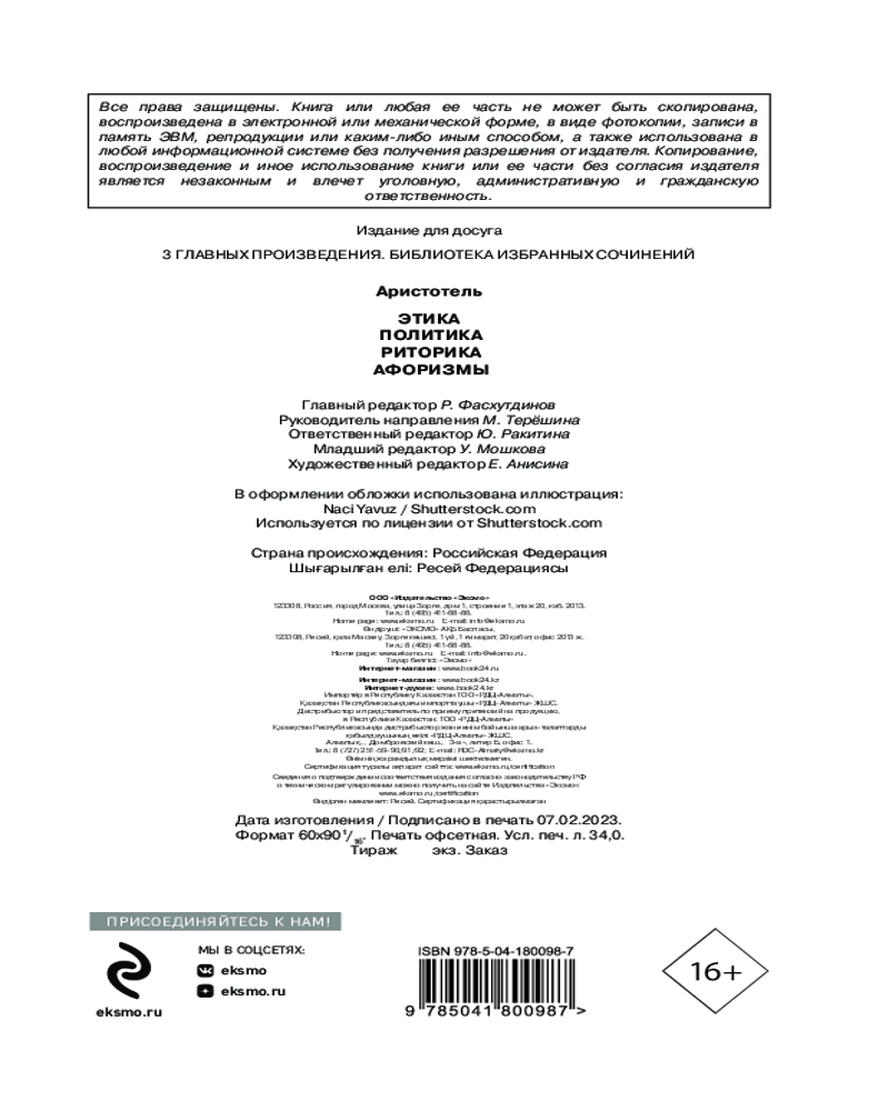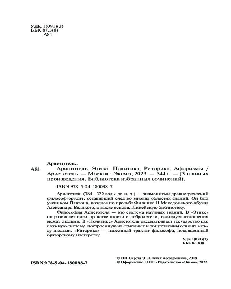 💳 Оплатить за товар можно при получении 🇰🇿 Есть бесплатная доставка по Казахстану от 1 дня 🎁 Копите бонусы с каждой покупки Серия: 3 главных произведения. Библиотека избранных сочинений Продолжение серии «3 главных произведения. Библиотека избранных сочинений». Три главных трактата и избранные афоризмы Аристотеля под одной обложкой! В «Этике» один из главных философов Античности рассматривает основы нравственности и добродетели человека, в «Политике» — разумное устройство общества, а в «Риторике» — искусство вести споры и убеждать оппонентов. Аристотель (384–322 годы до н. э.) — знаменитый древнегреческий философ. Ученик Платона, позднее по просьбе Филиппа II Македонского он обучал Александра Великого, а также основал Ликейскую библиотеку. Аристотель смог сформировать собственную философскую систему, не потерявшую актуальности и по сей день. |