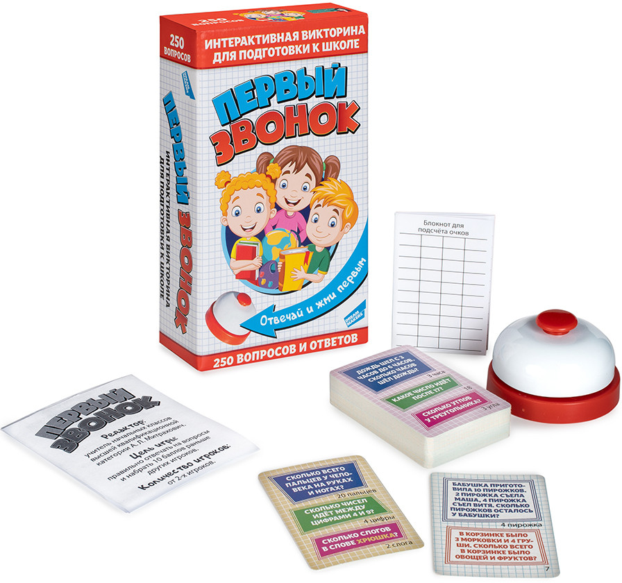 «Первый звонок» — это интерактивная викторина, которая поможет ребёнку легко и в игровой форме подготовиться к поступлению в школу, отвечая на разнообразные вопросы из карточек. Развивающая настольная игра включает 250 разносторонних вопросов, направленных не только на проверку знаний детей, но и на развитие логики, внимания и мышления. |