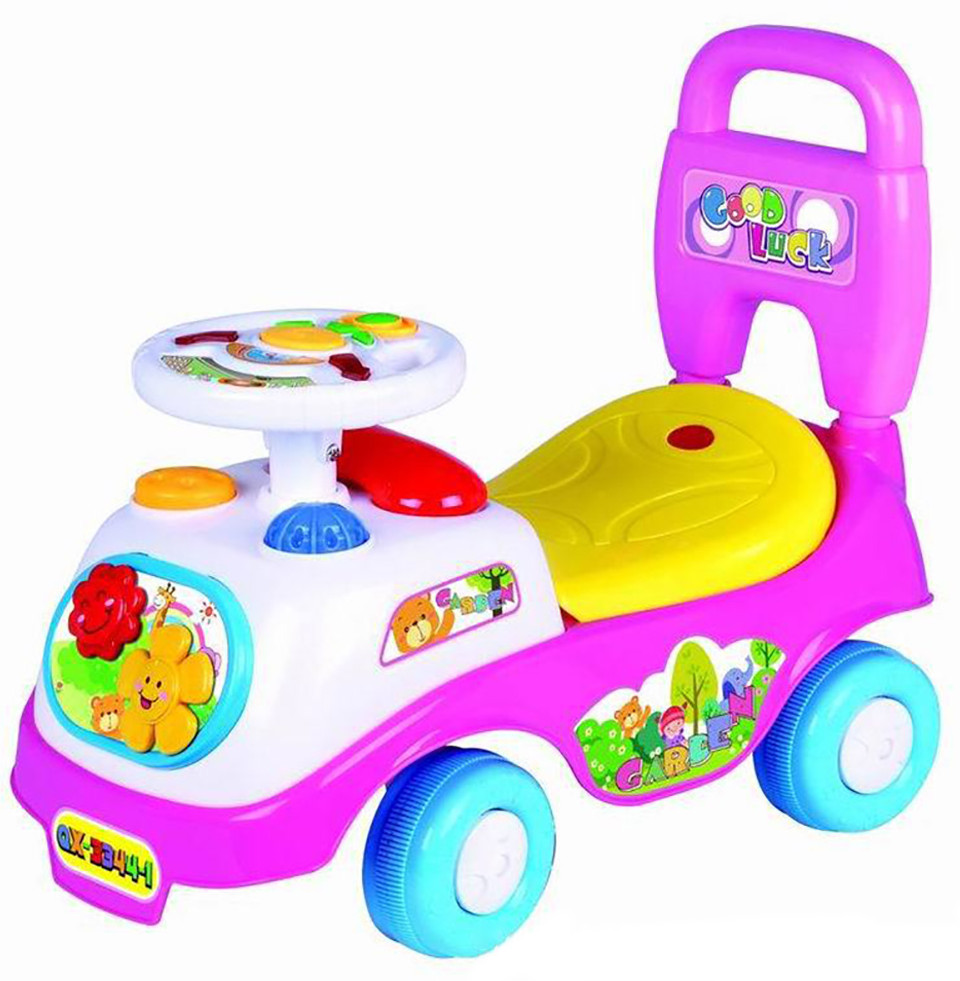 Эта симпатичная машинка-каталка станет первым транспортным средством для малышей от 1-го годика. Кататься на ней так весело! Малыш садится на удобное сиденье и отталкивается от пола ножками, развивая координацию движений. Если ребёнку захочется облокотиться, в каталке предусмотрена высокая спинка. Под откидным сиденьем спрятан отсек, в котором можно перевозить небольшие игрушки. На передней части корпуса машинки расположен телефончик на верёвочке, а также две кнопки и два цветочка-их можно крутить и слушать забавный трескучий звук. В руле предусмотрены яркие светозвуковые эффекты: нажимая на крупные кнопочки, малыш послушает английские песенки и забавные автомобильные и телефонные звуки, сопровождаемые подсветкой стрелочек.