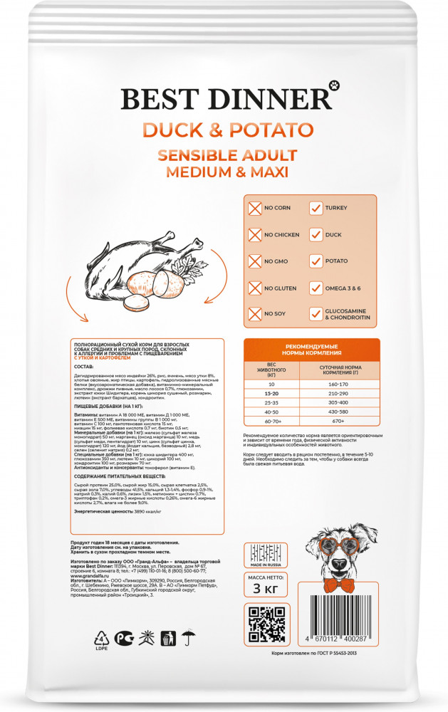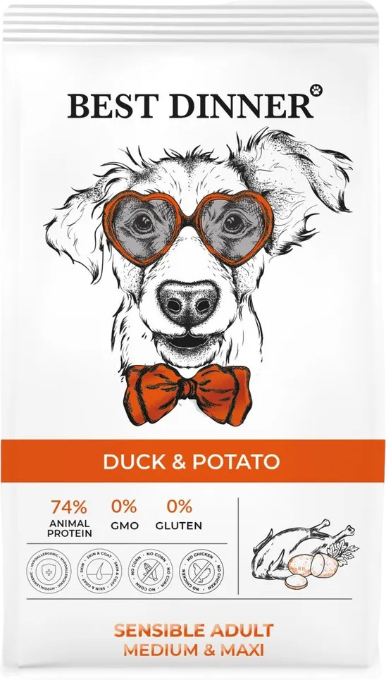 Best Dinner Корм для собак средних и крупных пород с уткой и картофелем-20% +565