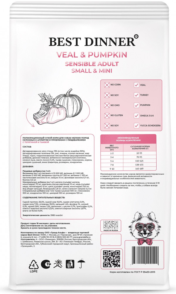 Best Dinner Корм для взрослых собак мелких пород с телятиной и тыквой-20% +288