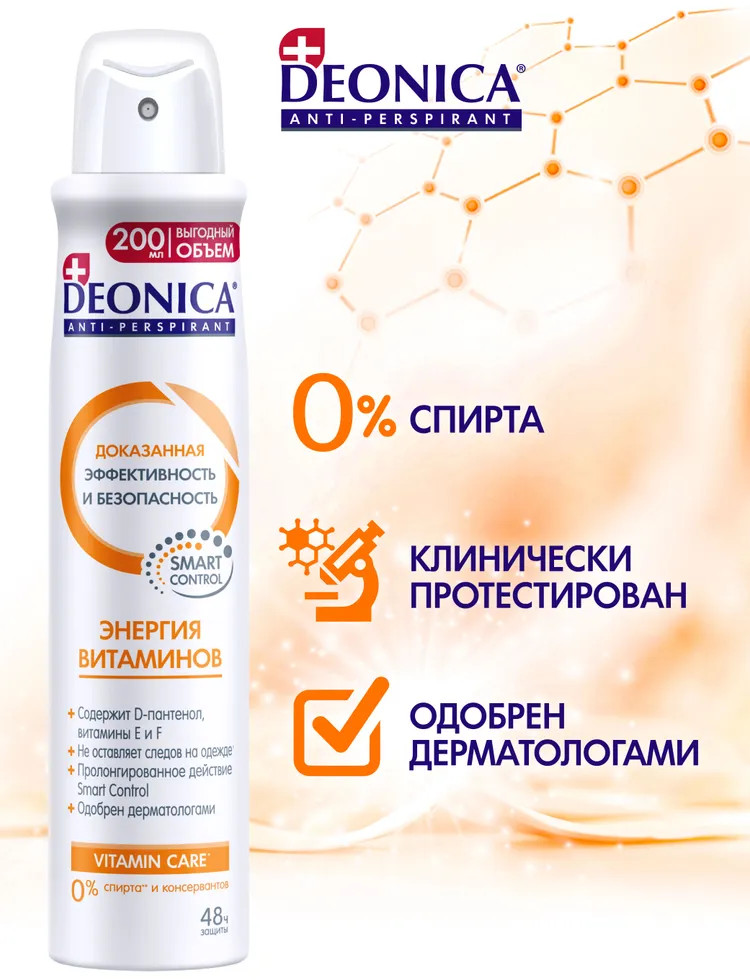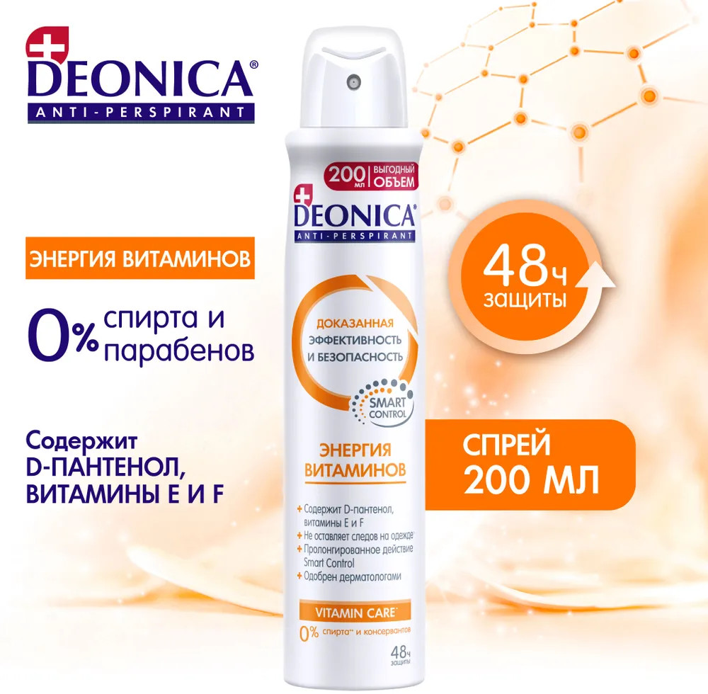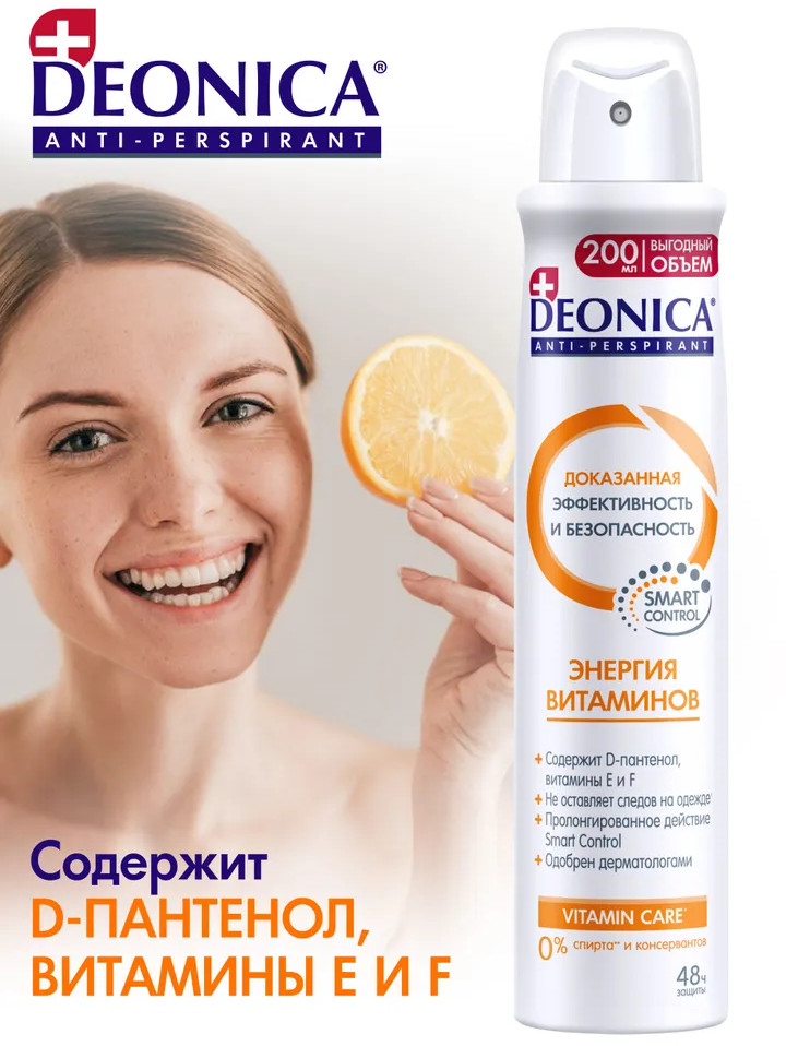 Deonica Дезодорант «Энергия витаминов»-25% +18 нет пота большой объём нет запаха белые пятна
