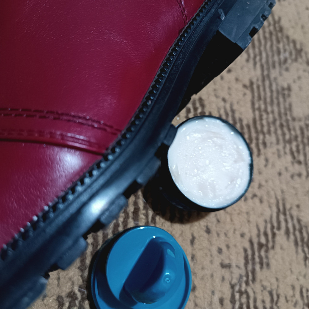 Крем шикарный, обувь блестит, как новенькая. Очень хорошо крем распределяется и впитывается, без разводов. Блеск держится достаточно долго. Подходит для любого цвета обуви, использовала на красных полусапожках, белых сапогах, на черных туфлях, коричневых ботинках мужа. Все идеально.