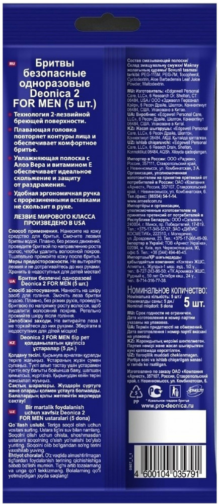 Deonica Бритва одноразоваяВ данный момент этот товар отсутствует в продаже. Возможно, у нас найдется аналогичный или похожий товар здесь. «Deonica for men» — идеальное решение для путешествия или ежедневного использования. Плавающая головка безопасной бритвы повторяет контуры лица, сбривая волосы любой густоты и плотности с лица, тела, подмышек, интимных зон, спины, рук, ног и других частей тела, лица, головы. Лезвия из нержавеющей стали произведены в США. Одноразовая бритва «Deonica for men» снабжена удобной ручкой. Увлажняющая полоска с алоэ вера и витамином Е смягчает кожу и снимает раздражение. Бритва мужская подходит для полноценного бритья или подбривания. После использования бритву следует промыть водой, не касаясь лезвий. Бритвы занимают мало места в багаже и удобны для путешествия или командировок, для дачи или ночевки не дома, для экстренных случаев (перед операцией, в роддом). |