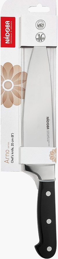 Nadoba Нож поварской «Arno»В данный момент этот товар отсутствует в продаже. Возможно, у нас найдется аналогичный или похожий товар здесь. Серия: Arno Нож изготовлен из цельной стальной заготовки путем горячей ковки, которая обеспечивает улучшение структуры металла и длительный срок службы ножа. Выполнен из высококачественной кованной нержавеющей стали X50CrMoV15 премиум-класса с добавлением молибдена и ванадия, прочный, износостойкий. Сталь клинка обладает высокой твердостью (56-58HRC) и имеет клиновидный профиль. Лезвие ножа остаётся острым долгое время, не требует частой заточки. |