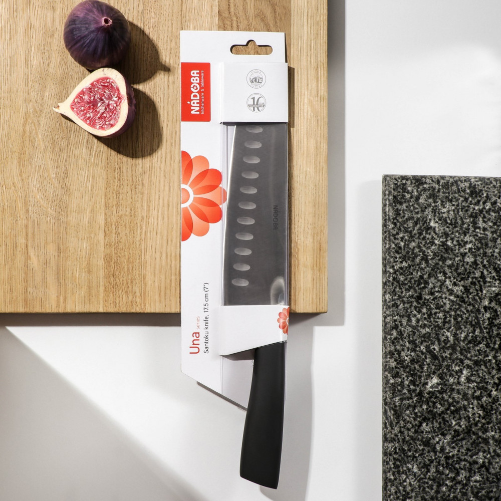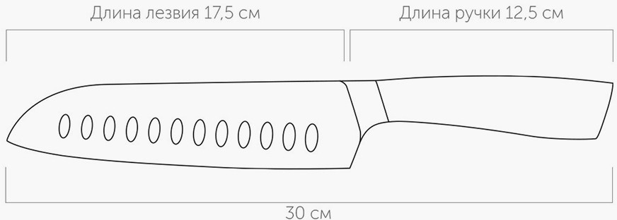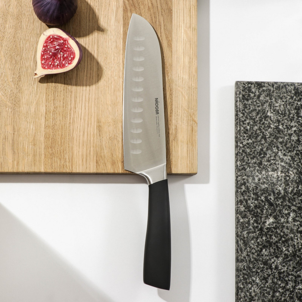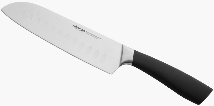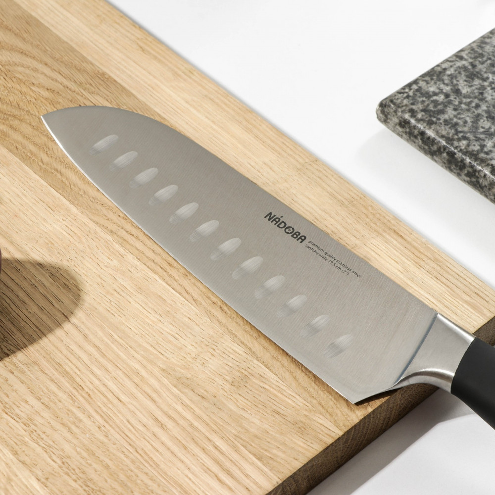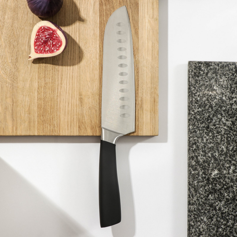 Нож-сантоку удобен для резки мелкими ломтиками или кубиками рыбы, мяса, сыра и овощей. Клинок ножа сильнее заточен в носовой части, для более точной и тонкой нарезки. Углубления на лезвии позволяют уменьшить прилипание пищи. Нож выполнен из высококачественной стали X50CrMoV15, благодаря высокому содержанию углерода и специальной термообработке, обладает очень высокой твёрдостью (56-58 HRC), а добавление молибдена и ванадия значительно повышает устойчивость к износу и коррозии. Рукоятка изготовлена из кованой нержавеющей стали с покрытием софт-тач, которая не позволяет скользить ножу в руке во время работы. Нож изготовлен из цельной стальной заготовки путём горячей ковки, что обеспечивает улучшение структуры металла, хорошую балансировку ножа и длительный срок его службы.