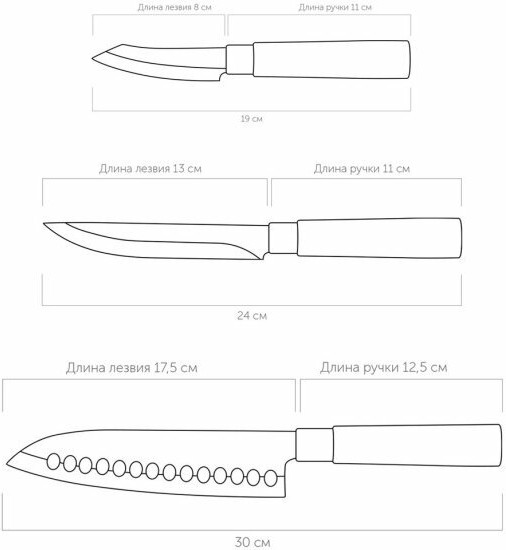 • нож универсальный — многофункциональный нож для повседневного применения. Удобен для нарезки большинства продуктов: мясо, сыр, рыба, овощи, фрукты, хлеб. Также может использоваться для чистки овощей и фруктов. Длина с ручкой — 24 см, вес — 36 г;