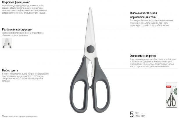 Эргономичная и прочная рукоятка будет удобна Вам и прослужит продолжительное время, что и обусловлено большим сроком гарантии. Пластиковая рукоятка удобно лежит в любой руке и не скользит, делая пользование ножницами максимально комфортным. Пластиковые кольца могут служить для подвешивания ножниц. Приятный цвет рукоятки отлично впишется даже в самый смелый интерьер. Отличительным достоинством ножниц является дополнительные встроенные функции, а именно: о: орехокол, открывалка для крышек, лезвие-скребок для рыбьей чешуи.