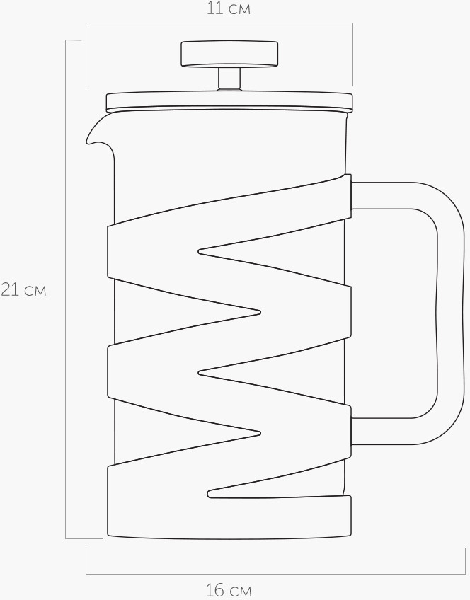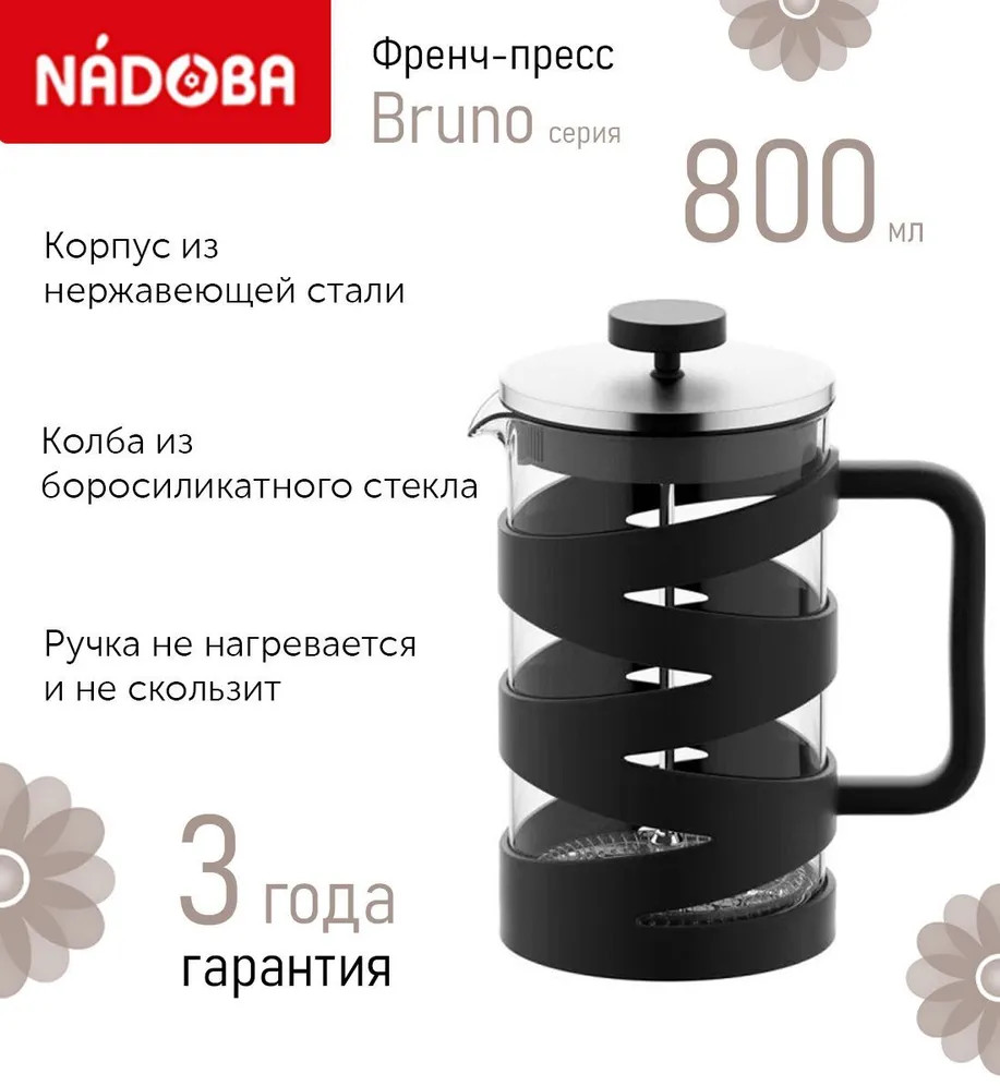 Френч-прессы серии «Bruno» имеют колбу, выполненную из жаропрочного боросиликатного стекла. Прочный подстаканник из высококачественного пластика обеспечивает дополнительную термоизоляцию и предохраняет колбу от повреждений. Многослойная система фильтрации френч-прессов выполнена из высококачественной нержавеющей стали 18/10. Удобная ручка не нагревается и не выскальзывает из рук. Разборная конструкция изделий и системы фильтрации обеспечивает лёгкий и качественный уход.