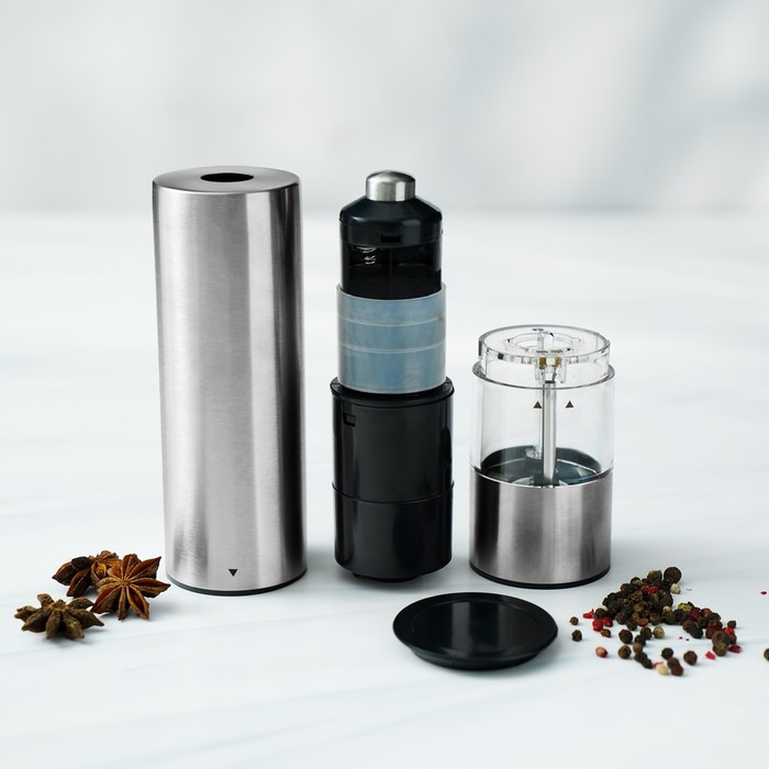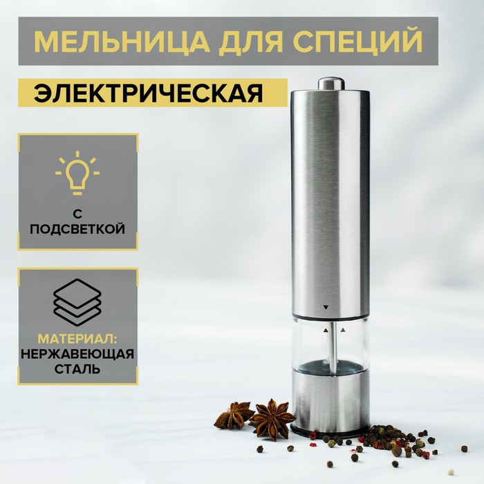 Magistro Мельница для специй электрическая «Steel»В данный момент этот товар отсутствует в продаже. Возможно, у нас найдется аналогичный или похожий товар здесь. Лаконичный и строгий дизайн перцемолки позволит ей вписаться в интерьер любой кухни и стать прекрасным подарком как для женщины, так и для мужчины. Корпус электромельницы эргономичен и выполнен из высококачесвенного материала. Электрический измельчитель заменит Вам традиционные солонки и перечницы и позволит перемолоть любые специи без применения физической силы — просто нажав кнопку. Прекрасно подойдет для подарка на новоселье родным и близким. |