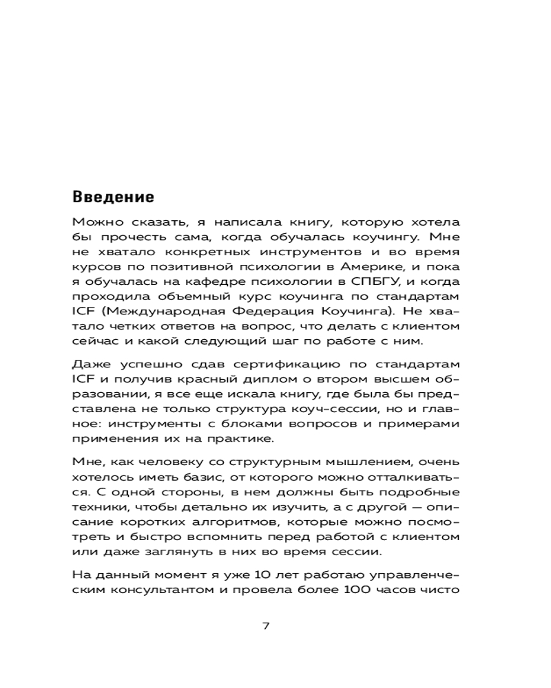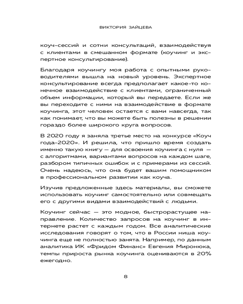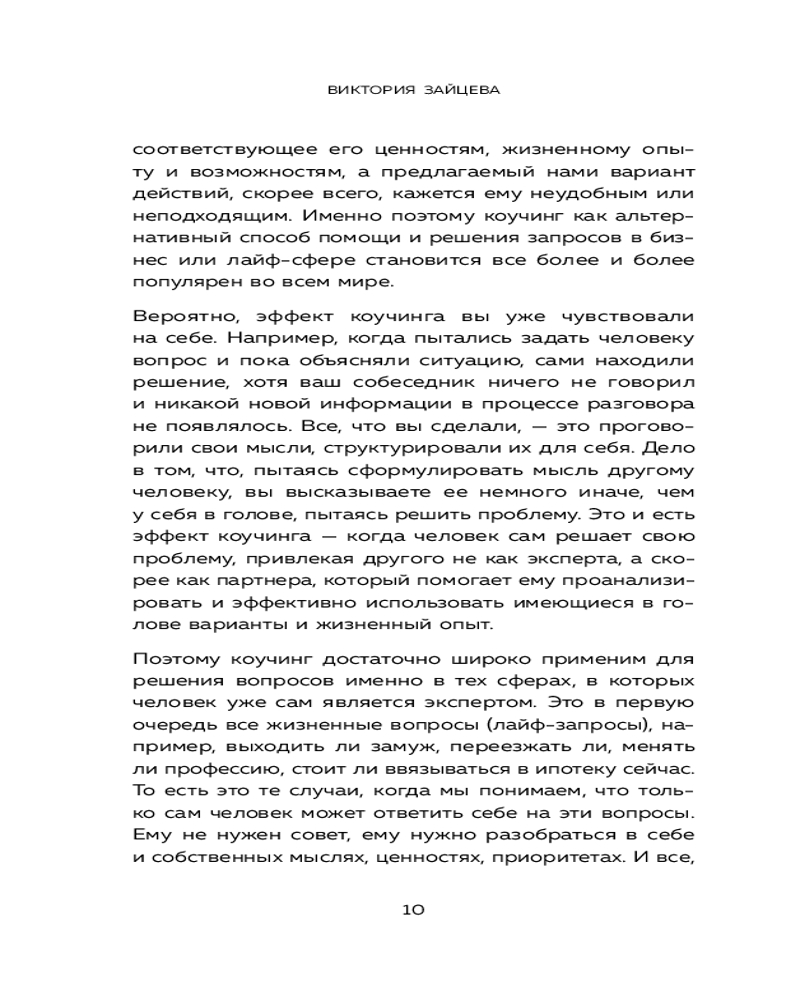 Автор книги помогает молодым коучам проводить эффективные для клиента сессии, находясь в «потоке» и ощущая душевный подъем. Зная главный страх начинающих коучей — растеряться на встрече, Виктория Зайцева собрала в одной книге универсальные техники, которые в различных комбинациях подойдут для работы с любым запросом клиента. Автор приводит примеры из своей практики, где она использовала эти методики, предлагает структуру коуч-сессии, варианты вопросов для каждого инструмента и дает советы, как быстро включить коуч-позицию. С этой книгой вы будете готовы к любой сессии!