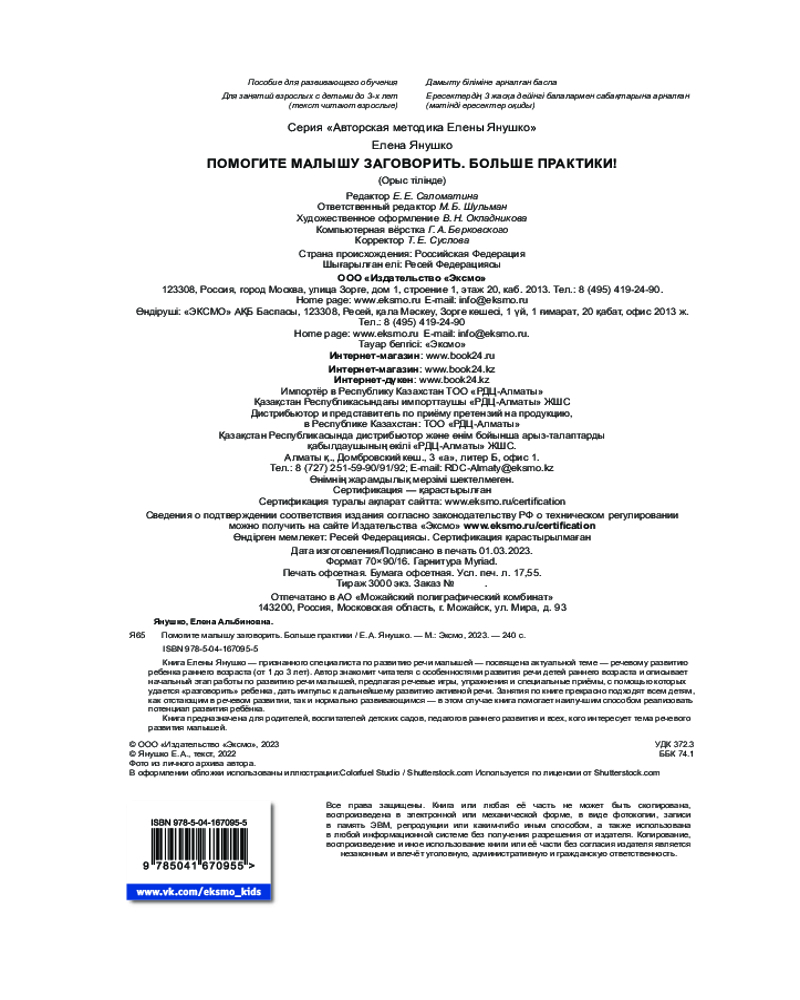 В данный момент этот товар отсутствует в продаже. Возможно, у нас найдется аналогичный или похожий товар здесь. Серия: Авторская методика Елены Янушко Если вы хотите, чтобы ваш ребёнок поскорее начал говорить и при этом его речь была чистой и правильной, то эта книга — самый настоящий клад! Признанный специалист по раннему развитию Елена Янушко поможет «разговорить» самого тихого и неразговорчивого малыша.