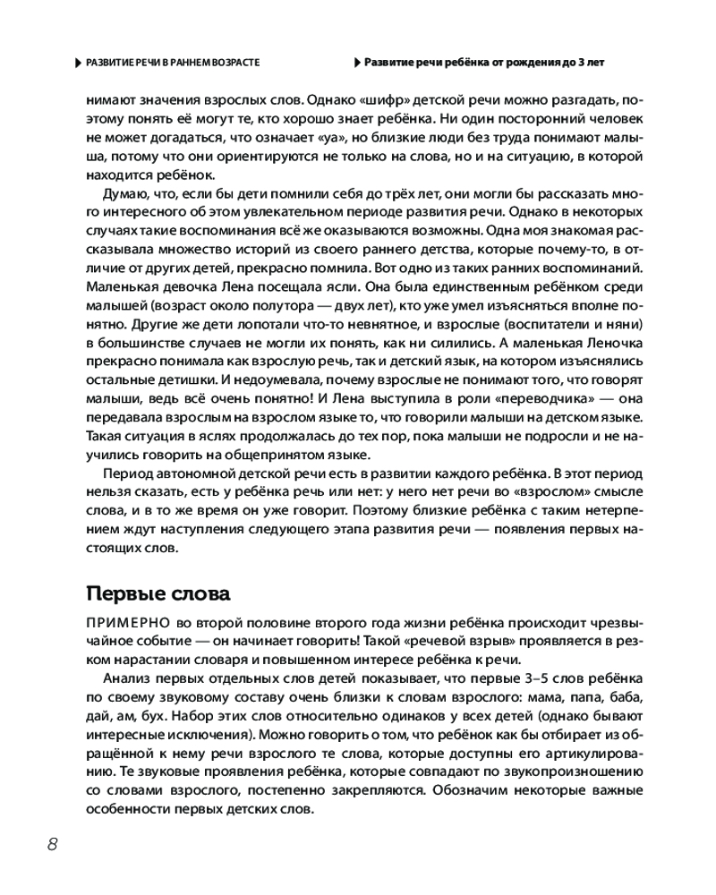 В её книге вы найдёте множество предметных игр, нацеленных на развитие речи, примеры бесед по предметным и сюжетным картинкам, специальные приёмы развития активной речи, а также описания особенностей развития речи мальчиков и девочек. Все игры и приёмы сопровождаются подробными комментариями и описаниями. |