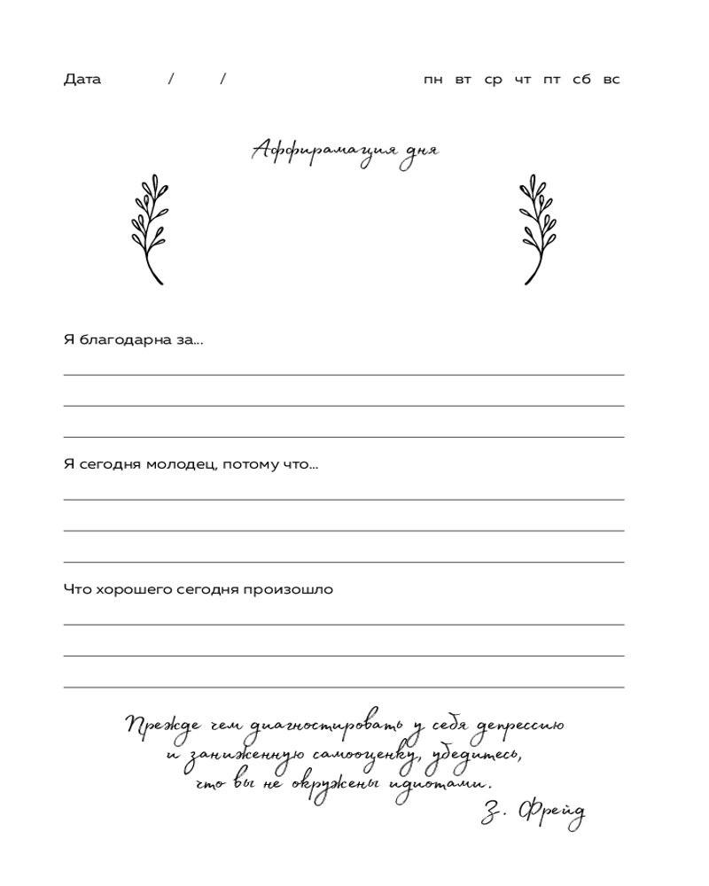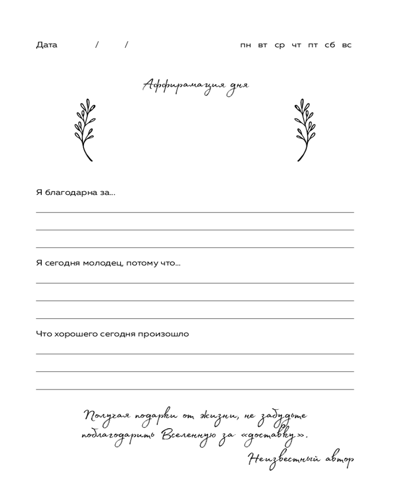 Дневник благодарности. 90 дней, которые станут началом удивительных перемен в жизниэстетичный понятная структура три раздела саморазвитие В данный момент этот товар отсутствует в продаже. Возможно, у нас найдется аналогичный или похожий товар здесь. Серия: Блокноты позитивных изменений Изменить свою жизнь возможно. Нужно только желание и 5 минут в день! |