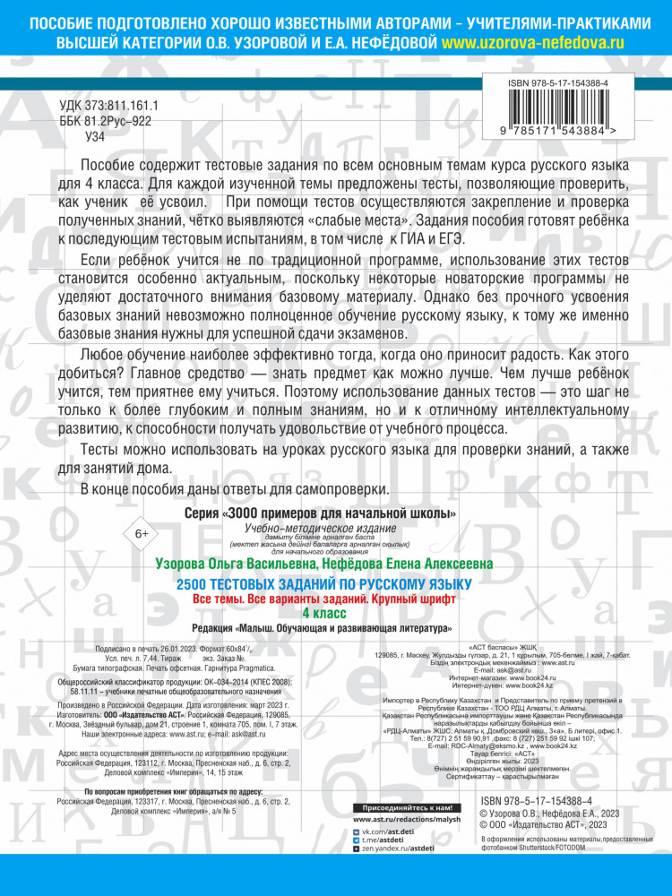 2500 тестовых заданий по русскому языку. 4 класс. Все темы. Все варианты заданий. Крупный шрифтОльга Васильевна Узорова, Елена Алексеевна Нефедова +60