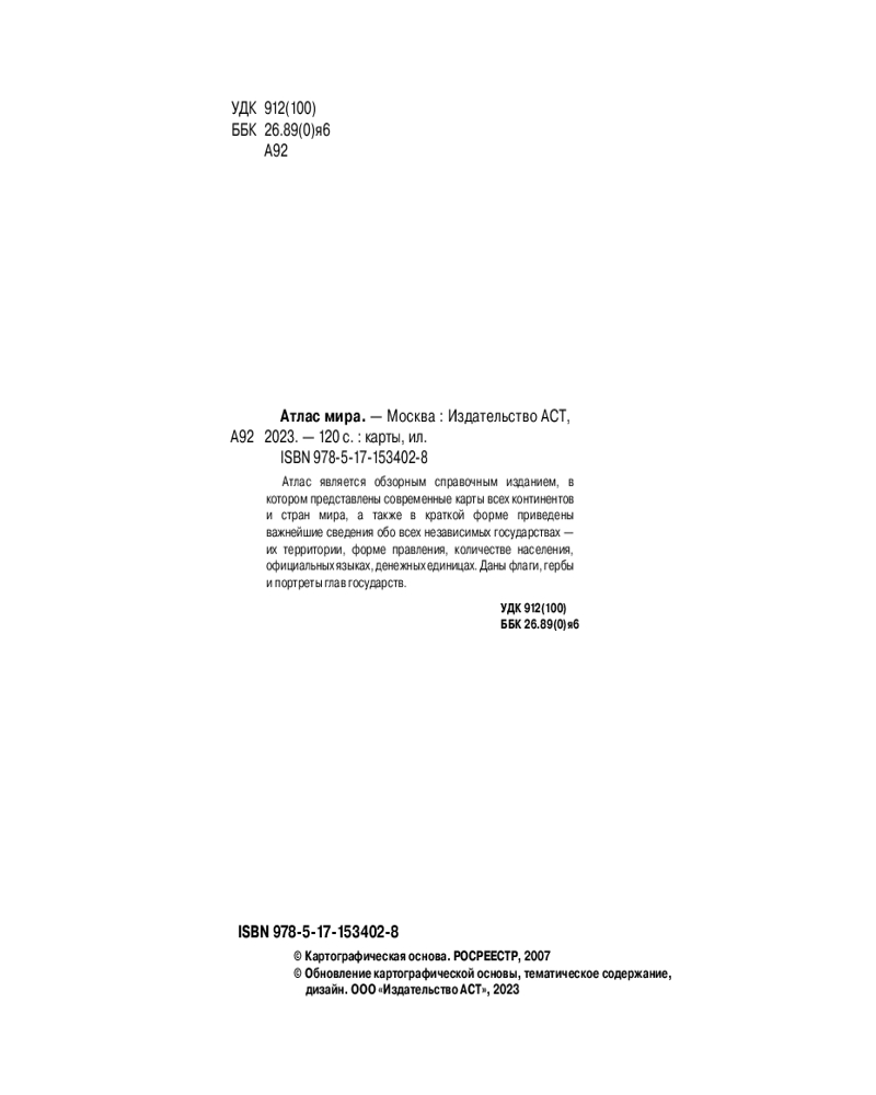 💳 Оплатить за товар можно при получении 🇰🇿 Есть бесплатная доставка по Казахстану от 1 дня 🎁 Копите бонусы с каждой покупки Серия: Атлас универсальный Данный Атлас — обзорное картографическое справочное издание, состоящее из более чем 80 современных карт, представляющих все континенты и страны мира. Карты дополнены краткими актуальными сведениями о каждой стране (площадь территории, количество населения, столица, форма правления, официальный язык(и), денежная единица, национальный и конфессиональный состав населения, флаг страны, портрет главы государства). |