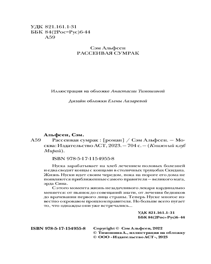 Рассеивая сумракВ данный момент этот товар отсутствует в продаже. Возможно, у нас найдется аналогичный или похожий товар здесь. Серия: Книжный клуб Мирай Нуска зарабатывает на хлеб лечением половых болезней и едва сводит концы с концами в столичных трущобах Скидана. Жизнь Нуски идет своим чередом, пока на пороге его дома не появляются приближенные самого правителя — великого мага, эрда Сина. |