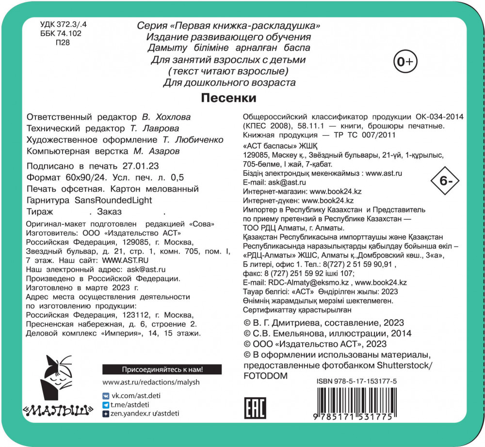 💳 Оплатить за товар можно при получении 🇰🇿 Есть бесплатная доставка по Казахстану от 1 дня 🎁 Копите бонусы с каждой покупки Серия: Первая книжка-раскладушка В яркой книжке-раскладушке «Песенки» собраны короткие стихотворные напевы, пришедшие к нам из глубины веков. В древности этот жанр фольклора являлся заговором-оберегом и защищал ребёнка от всех несчастий. |