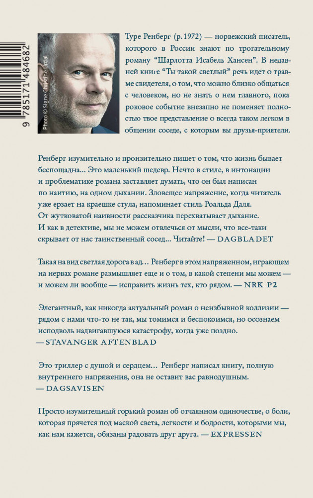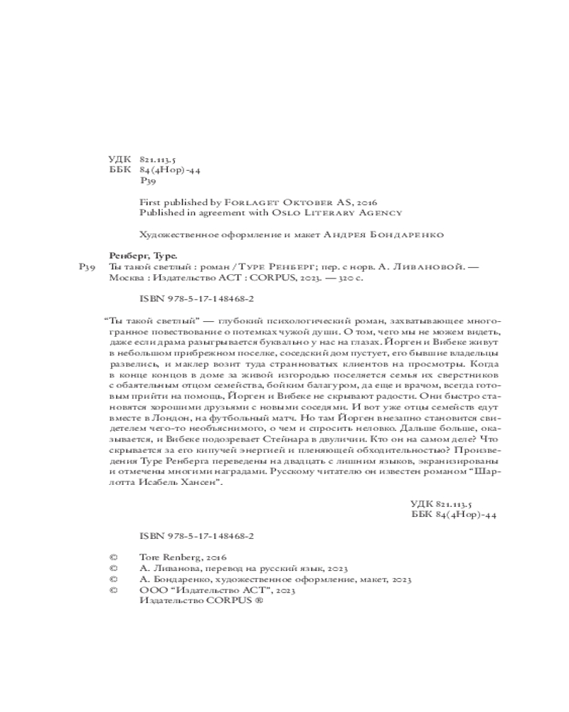 💳 Оплатить за товар можно при получении 🇰🇿 Есть бесплатная доставка по Казахстану от 1 дня 🎁 Копите бонусы с каждой покупки Серия: Corpus «Ты такой светлый» — глубокий психологический роман, захватывающее многогранное повествование о потемках чужой души. О том, чего мы не можем видеть, даже если драма разыгрывается буквально у нас на глазах. Йорген и Вибеке живут в небольшом прибрежном поселке, соседский дом пустует, его бывшие владельцы развелись, и маклер возит туда странноватых клиентов на просмотры. Когда в конце концов в доме за живой изгородью поселяется семья их сверстников с обаятельным отцом семейства, бойким балагуром, да еще и врачом, всегда готовым прийти на помощь, Йорген и Вибеке не скрывают радости. Они быстро становятся хорошими друзьями с новыми соседями. И вот уже отцы семейств едут вместе в Лондон, на футбольный матч. Но там Йорген внезапно становится свидетелем чего‑то необъяснимого, о чем и спросить неловко. Дальше больше, оказывается, и Вибеке подозревает Стейнара в двуличии. Кто он на самом деле? Что скрывается за его кипучей энергией и пленяющей обходительностью? Произведения Туре Ренберга переведены на двадцать с лишним языков, экранизированы и отмечены многими наградами. Русскому читателю он известен романом «Шарлотта Исабель Хансен». |