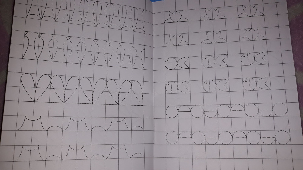 Отличная пропись для подготовки к школе. Тетрадь среднего формата, листы в крупную клетку, все задания это элементы, фигуры или орнаменты (например, листики, рыбки, зигзаги) обвести по пунктиру. Самому писать ничего не нужно, так что вполне подойдет и для 3 лет, кстати на обложке сзади так и написано 3+. Я этого не знала, взяла сыну 5 лет, но, думаю, ему тоже будет полезно. Некоторые элементы, например, рыбок, морковки (там где это возможно), мы еще и раскрашиваем.