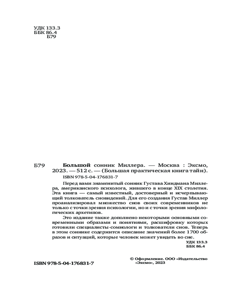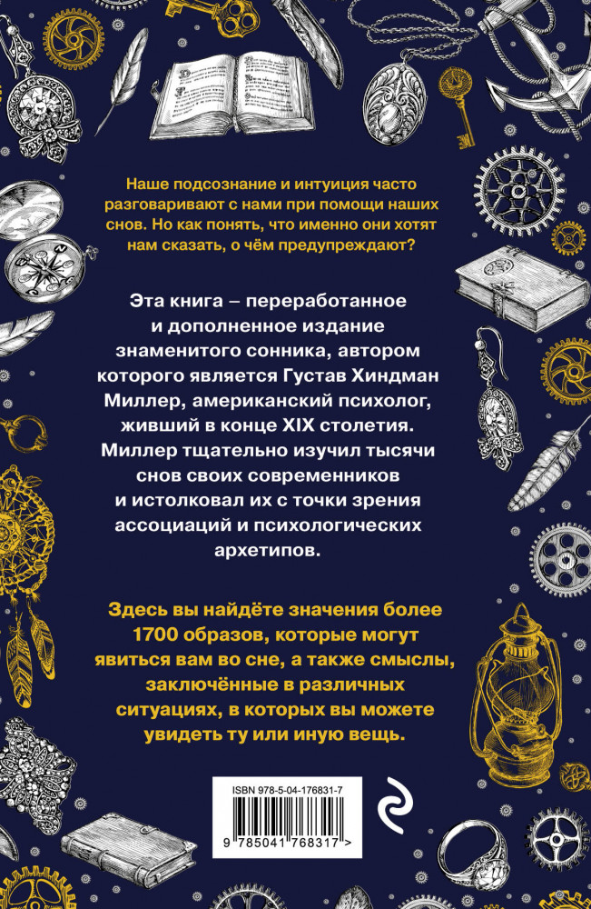 большой размер полезная удобная навигация В данный момент этот товар отсутствует в продаже. Возможно, у нас найдется аналогичный или похожий товар здесь. Серия: Большая практическая книга тайн Перед вами знаменитый сонник Густава Хиндмана Миллера, американского психолога, жившего в конце XIX столетия. Это издание также дополнено некоторыми основными современными образами и понятиями, расшифровку которым готовили специалисты-сомнологи и толкователи снов.