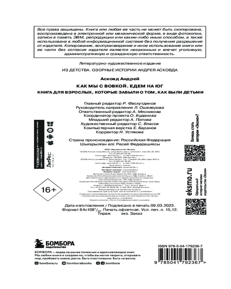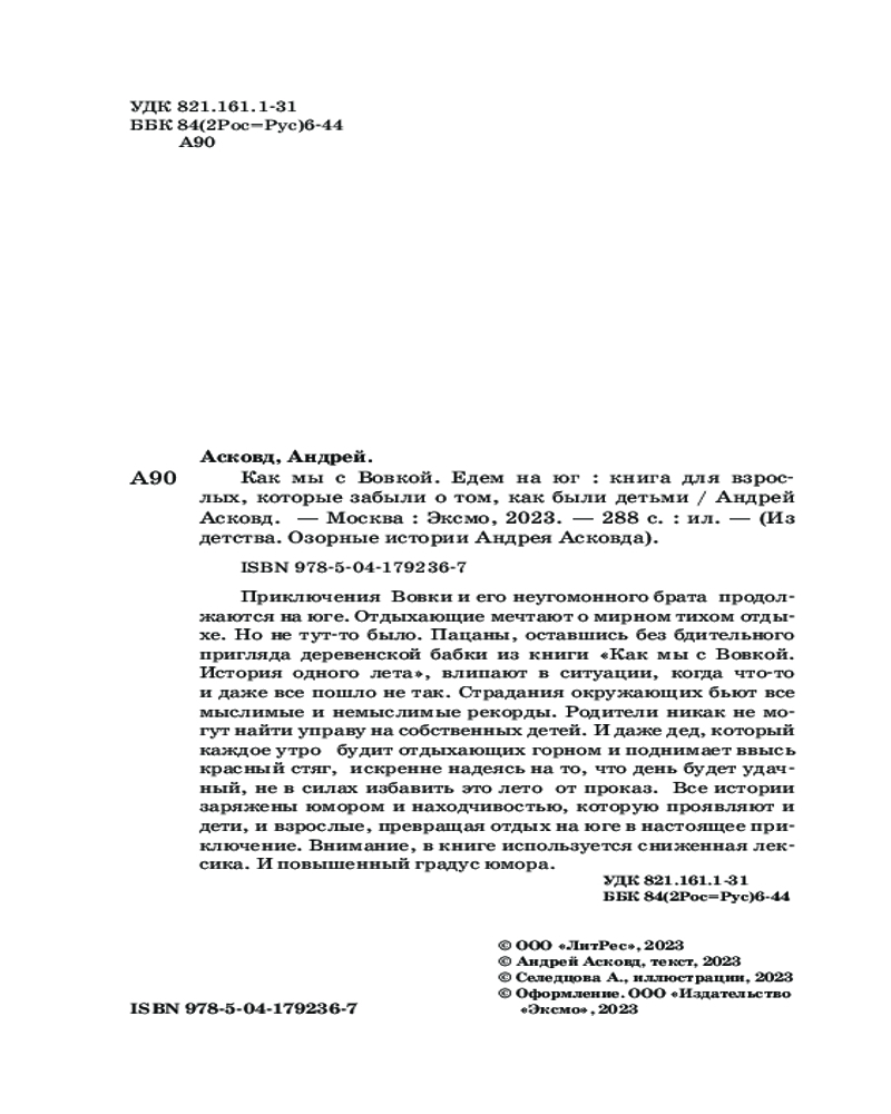 💳 Оплатить за товар можно при получении 🇰🇿 Есть бесплатная доставка по Казахстану от 1 дня 🎁 Копите бонусы с каждой покупки Серия: Из детства. Озорные истории Андрея Асковда Отдыхающие мечтают о мирном тихом отдыхе на морском берегу. Но не тут-то было... Вовка и его неугомонный брат, оставшись без бдительного пригляда бабки из книги «Как мы с Вовкой. История одного лета», влипают в ситуации, когда что-то и даже все пошло не так... Их выходки доводят отдыхающих до белого каления. И даже дед, который свято верит в силу красного стяга и утреннего горна, не в силах избавить это лето от каверз и проказ. |