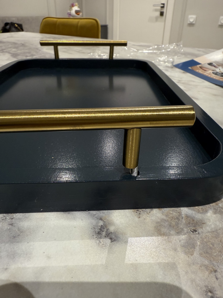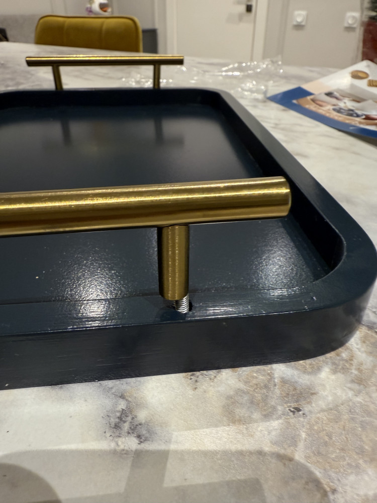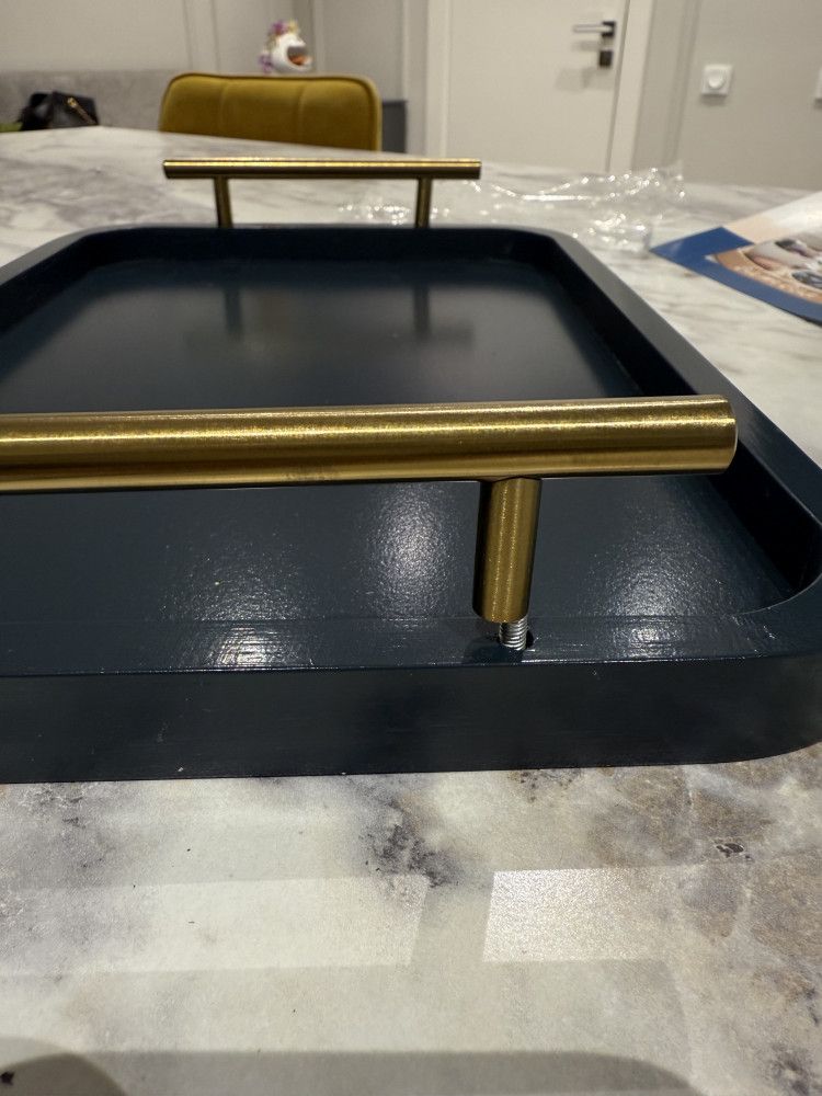 Пришел брак, ручка оказалась меньше расстояния для установки шурупов. Теперь просто болтается. Краска на подносе очень хрупкая, оставляет сразу царапины, поверхность не ровная вся в пупырышках каких то.